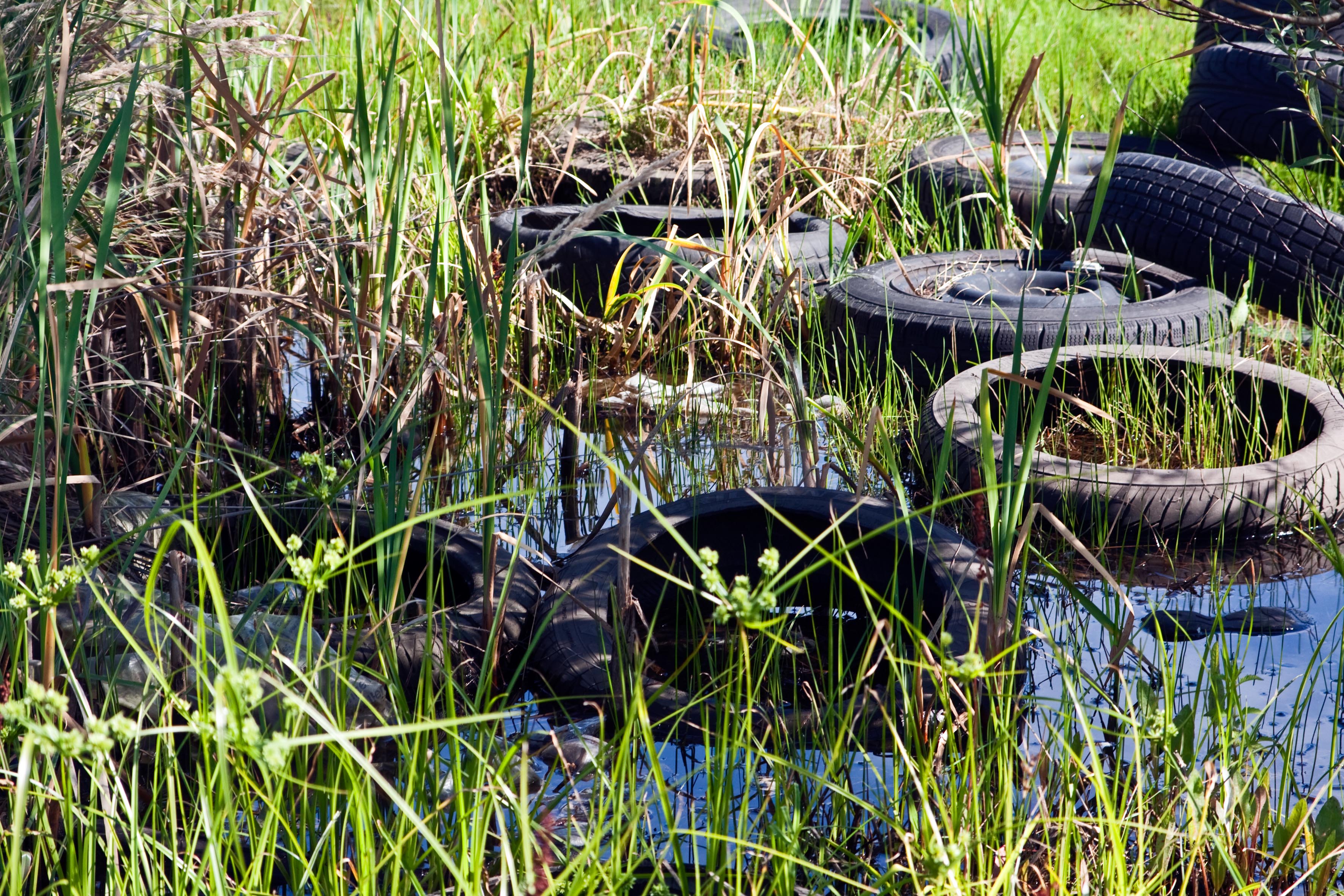 Alte Autoreifen liegen im Schilf, zwischen Gräsern im Wasser