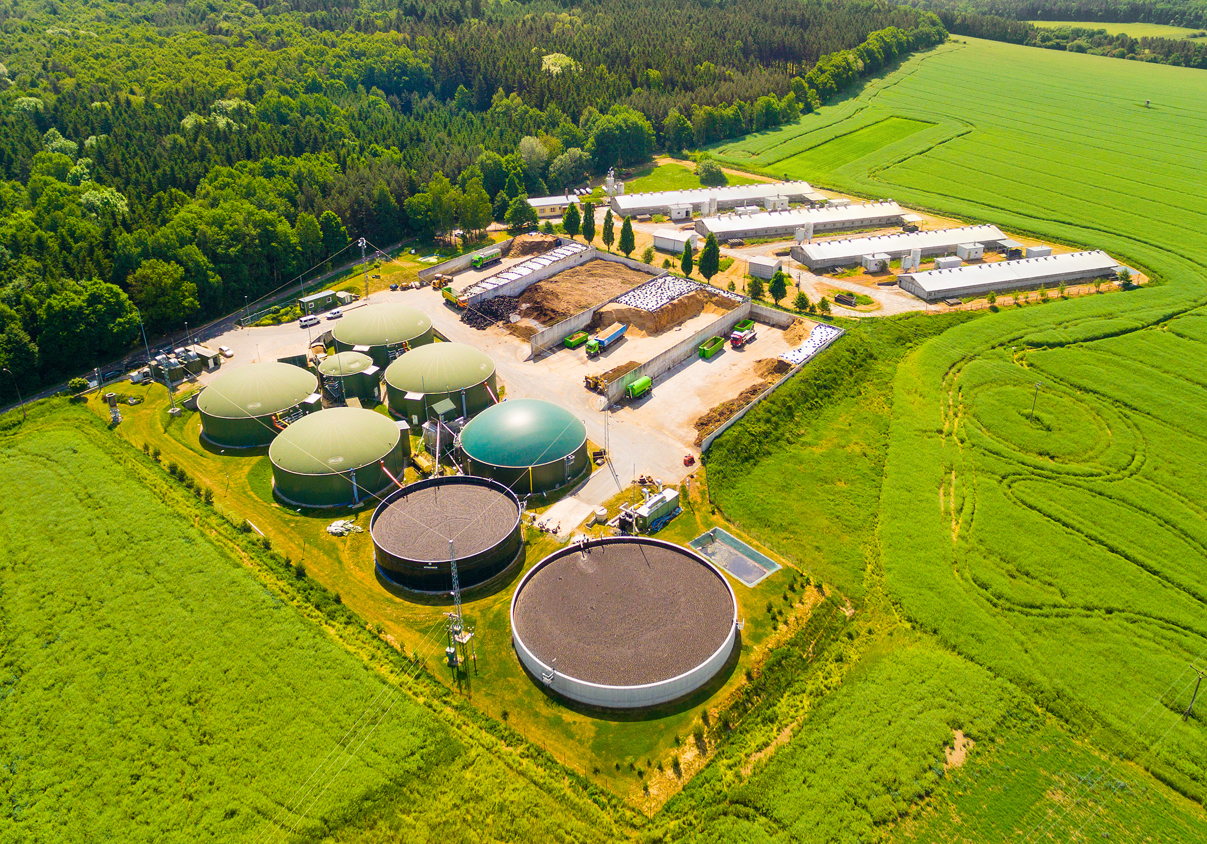 Luftbild einer Biogasanlage mit mehreren Anlagenteilen
