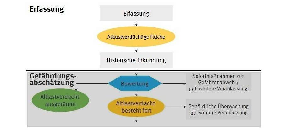 In der Grafik sind die verschiedenen Bearbeitungsschritte und Entscheidungsalternativen dargestellt. Das Verfahrensschema der aufeinanderfolgenden Untersuchungs- und Bewertungsschritte der Altlastenbearbeitung zeigt eine erfahrungsbasierte Vorgehensweise und ist nicht dogmatisch anzuwenden. Wird im Ergebnis eines Untersuchungsschrittes zweifelsfrei festgestellt, dass damit eine abschließende Gefährdungsabschätzung möglich ist, kann die zuständige Behörde entscheiden, dass keine weiteren Untersuchungsschritte erforderlich sind. Sie stellt fest, ob der Altlastverdacht ausgeräumt ist oder ob eine Altlast vorliegt. In diesem Fall kann sie auch die im Schema alternativ dargestellten Handlungsoptionen veranlassen. Die stoffbezogenen Bewertungsmaßstäbe werden im Abschnitt Prüf- und Maßnahmenwerte für Schadstoffe aufgezeigt.