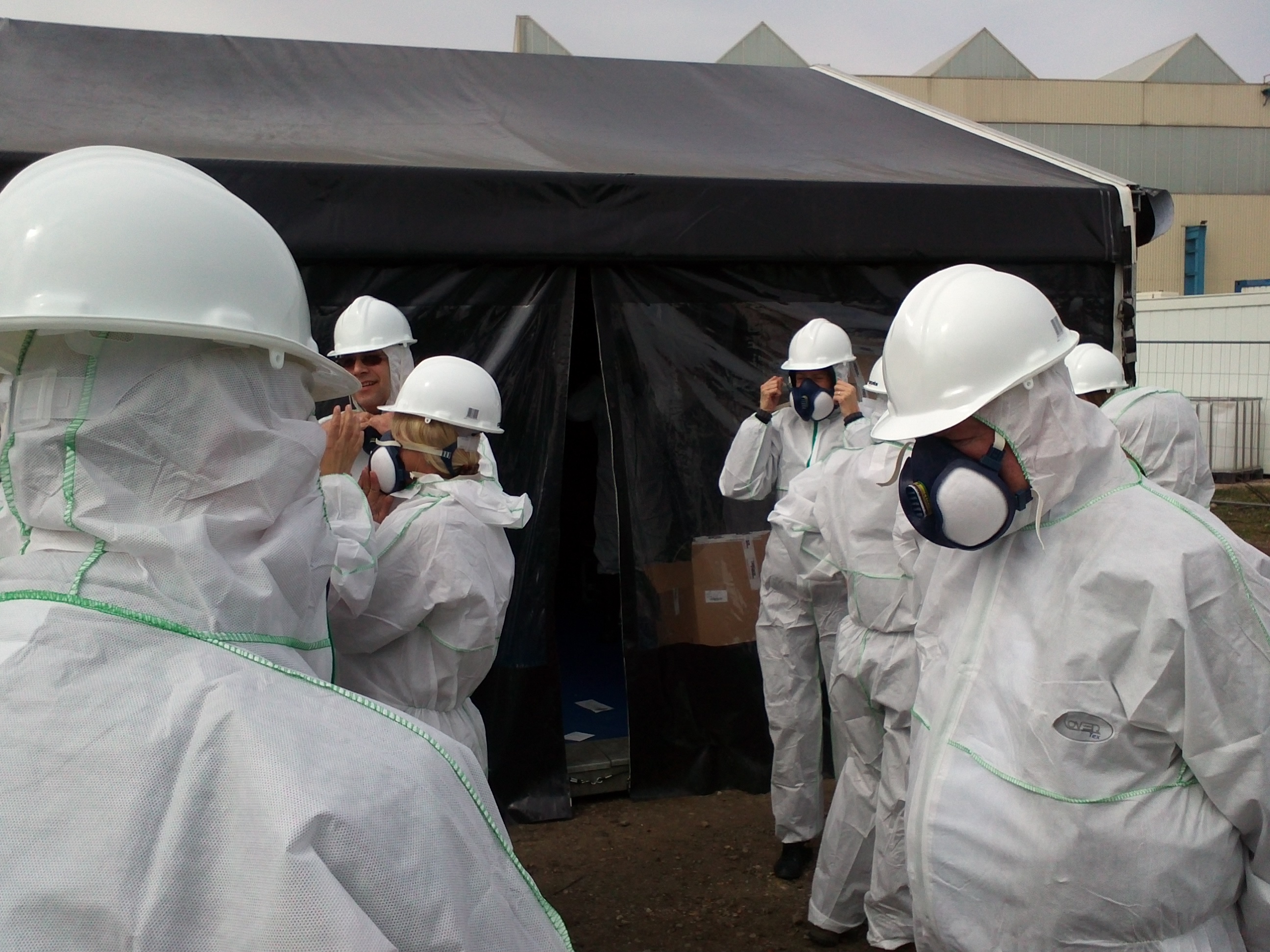 In kontaminierten Bereichen sind bei Sanierungsarbeiten besondere Arbeitschutzvorkehrungen zutreffen, wie hier im Bild, das Tragen persönlicher Schutzausrüstungen.