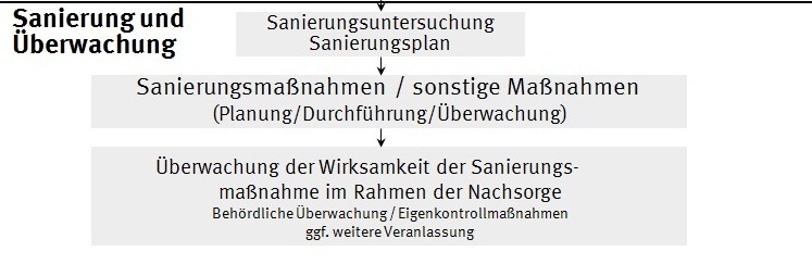 Die Grafik stellt die nach der behördlichen Festellung der Altlasten erforderlichen Bearbeitungsschritte zusammen. Beginnend bei derSanierungsuntersuchung, über die Sanierung bis hin zur Überwachung und Nachsorge.
