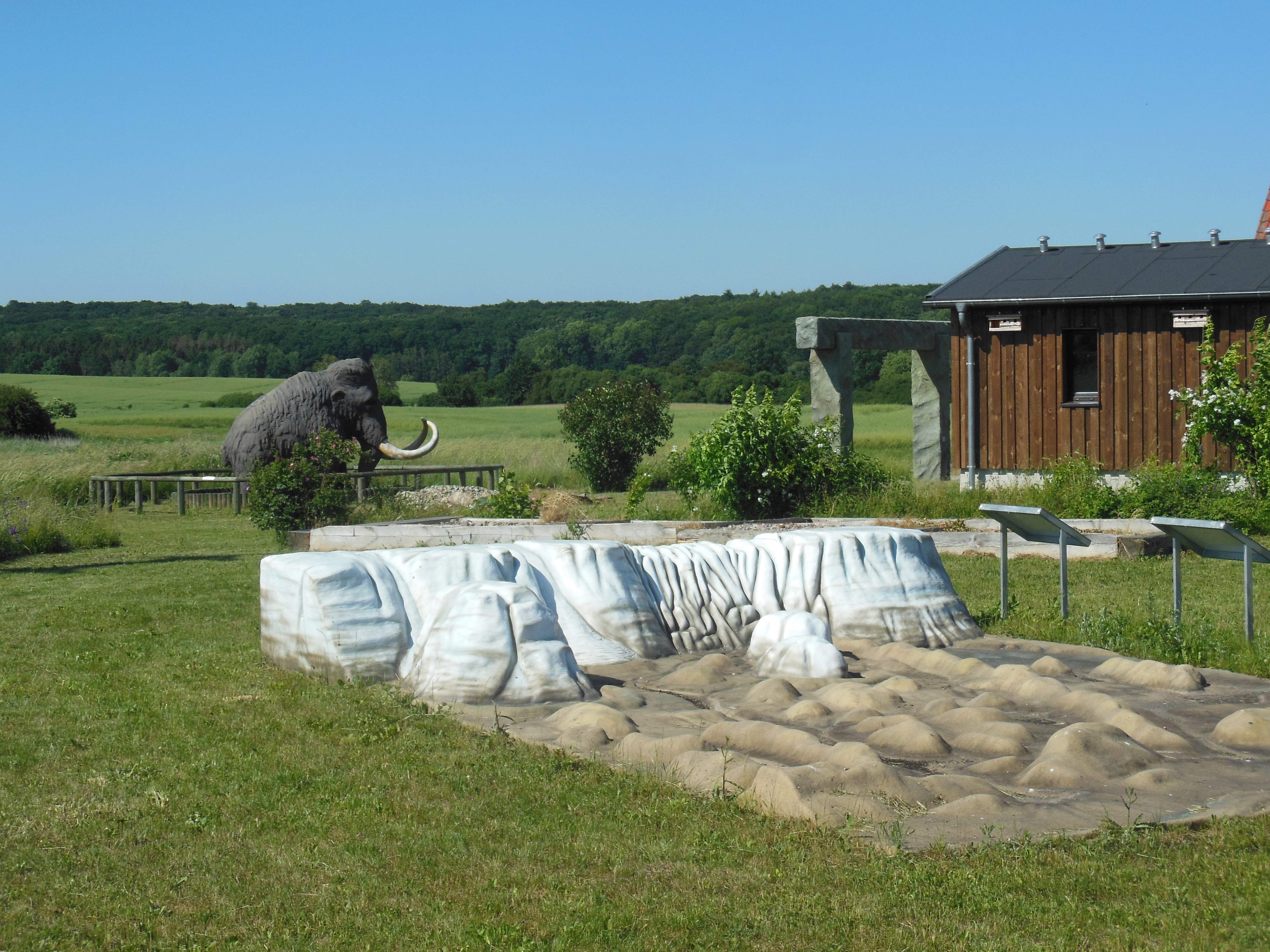 Gut informiert können Sie sich nun auf den Weg ins Außengelände begeben. Vorbei am Mammut Georg, dem Maskottchen des Geoparks Eiszeitland am Oderrand, führt ein ca. 11 km langer Rundweg, welcher auch in Teilstrecken erlebt werden kann, durch eine reizvolle Landschaft. Erstes Etappenziel ist der Aussichtspunkt Kiesgrube. Von der Aussichtsplattform aus, bietet sich Ihnen ein fantastischer Blick in einen aktiven Tagebau. Die Sanderfläche ist der Pommerschen Endmoräne vorgelagert. Viele Straßen und Häuser der Region wurden in vergangenen Zeiten meist aus Feldsteinen erbaut. Ein Rohstoff, welcher dank der letzten Eiszeit in der Region häufig zu finden ist. Daraus entwickelte sich auch bis in die 1960ger Jahre der Industriezweig der Steinschlägerei. In der Sperlingsherberge, dem nächsten Etappenziel haben Sie die Möglichkeit die Blockentmoränenpackung der pommerschen Eisrandlage hineinzuschauen. Imposante Geschiebe befinden sich noch heute in den ehemaligen Abbruchkanten. Wie aus dem Rohstoff Stein, ein Baustoff wurde und wofür dieser Verwendung fand erfahren Sie auf dem letzten Etappenziel, den Ihlowbergen. Auf Tafeln an den Erlebnispunkten erhalten Sie nähere Informationen zu den Themen vor Ort.
