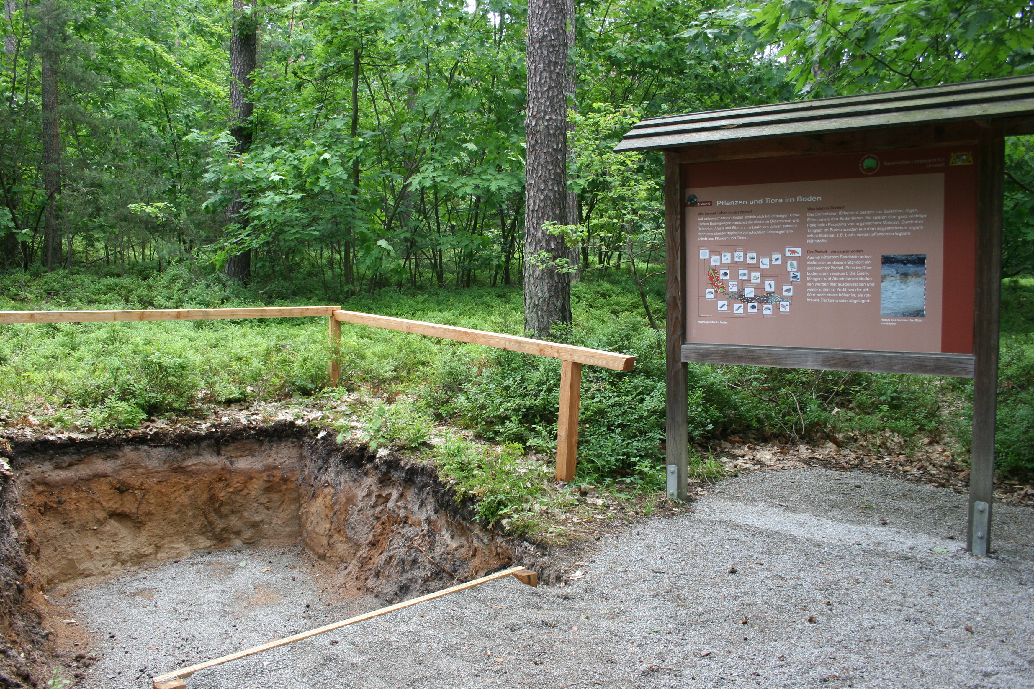 Die einzelnen Bodenaufschlüsse, zum Beispiel Ton-, Sand- und Stauwasserboden, liegen direkt am befestigten Weg und sind somit gut auffindbar. Profile, die etwas weiter im Wald liegen (erste und letzte Tafel), sind durch große Wegweiser ausgeschildert.