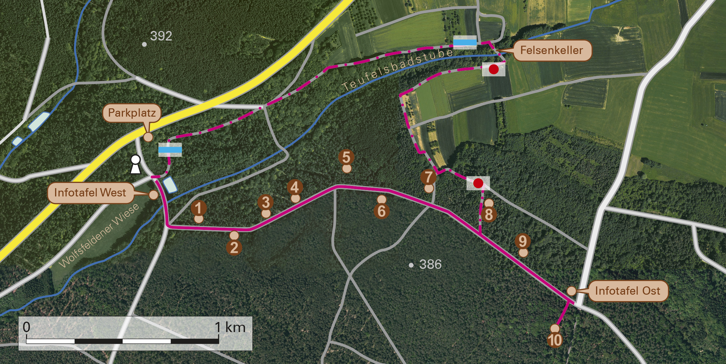 Der 1,5 km lange Bodenerlebnispfad Kalchreuth-Wolfsfelden beginnt und endet am Parkplatz in der Nähe der Wolfsfelder Wiese. Folgt man der Wegmarkierung (roter Fuchs auf gelbem Hintergrund) führt die Ausschilderung zu zehn Stationen mit interessanten Fachinformationen zum Thema Boden und der Möglichkeit ihn an acht Stationen mit den Händen zu begreifen.