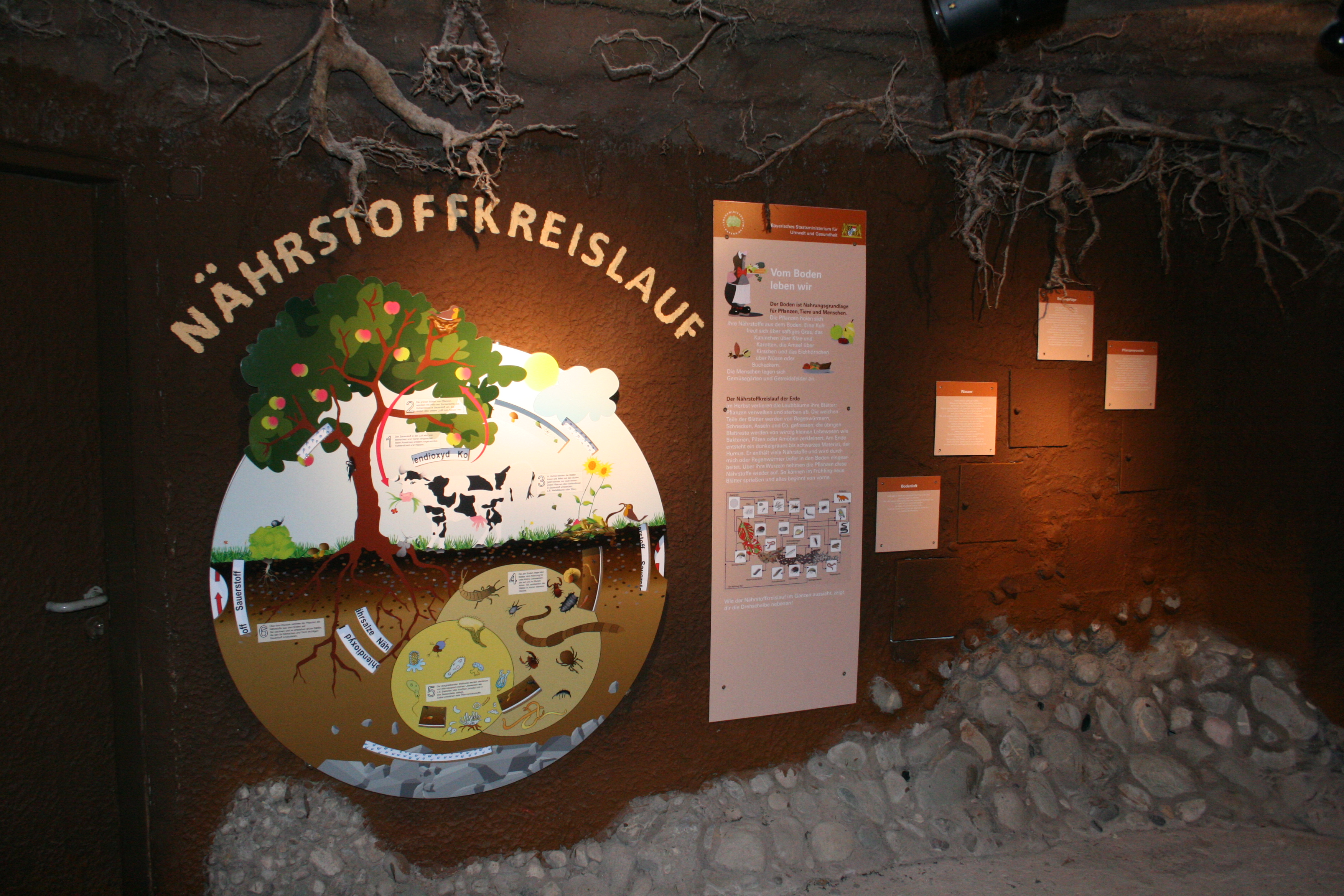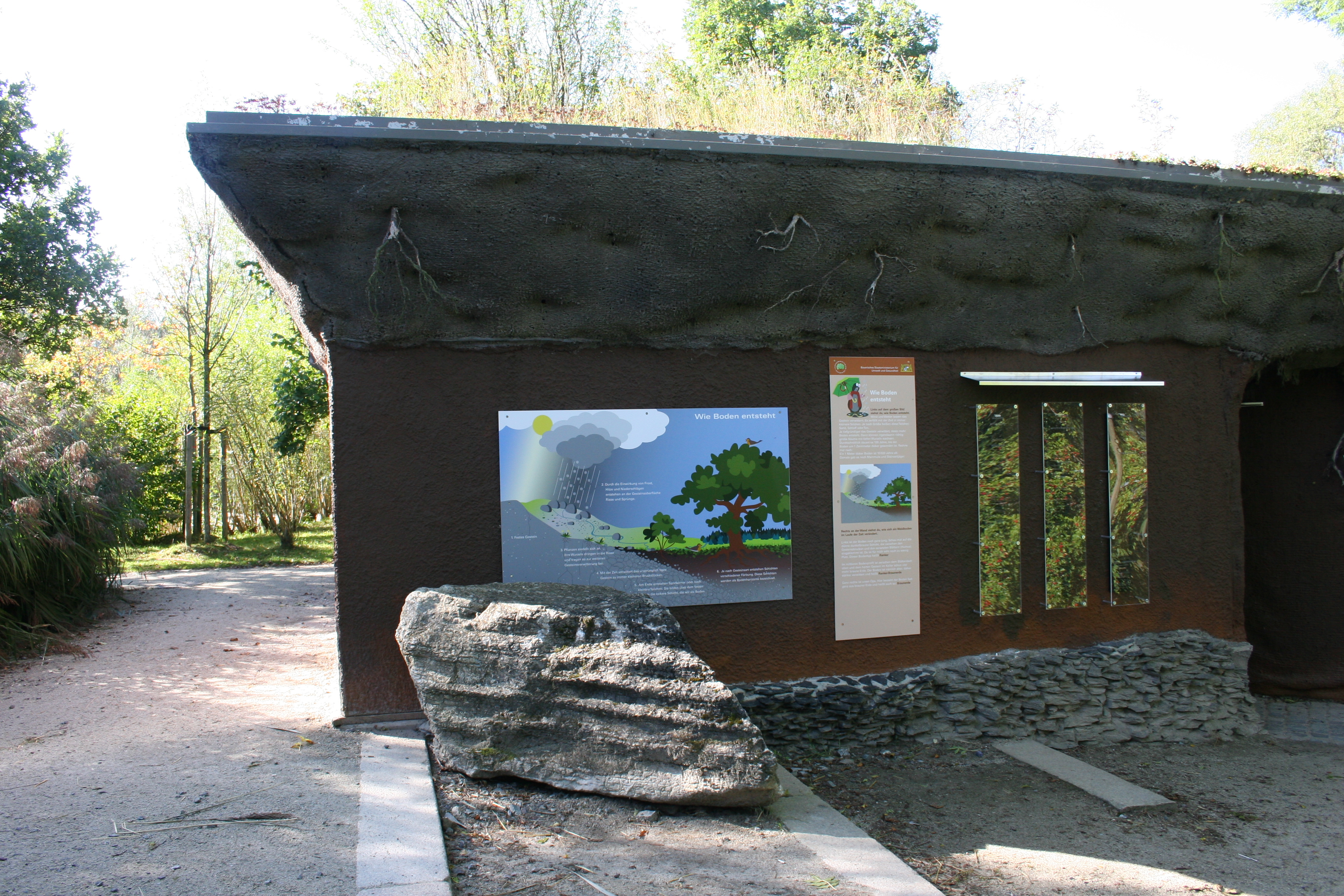 Die Erdaustellung "Erlebniswelt Boden" befindet sich gleich gegenüber. An sieben Stationen wird erklärt, wie sich Boden entwickelt, wer so alles in ihm wohnt, welche Gefahren für den Boden bestehen und was in ihm verborgen sein kann.