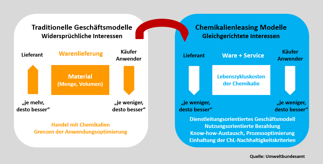 Bei dem innovativen Geschäftsmodell Chemikalienleasing wird die klassische mengenbezogene Bezahlung (€/t) von Chemikalien durch eine nutzenorientierte Bezahlung (z. B. €/m2 gereinigte Fläche) ersetzt. Dadurch ändert sich der Chemikalienverbrauch für den Chemikalienhersteller von einem Erlös- zu einem Kostenfaktor. Der Chemikalienhersteller hat in diesem Geschäftsmodell ein wirtschaftliches Interesse, den Verbrauch von chemischen Produkten beim Anwender durch Prozessoptimierung zu verringern. In der Konsequenz kommt es zu einer intensivierten Zusammenarbeit zwischen Chemikalienhersteller und -anwender. Beide Partner haben durch den verringerten Chemikalienverbrauch nicht nur wirtschaftliche Vorteile, sondern schonen Ressourcen, entlasten die Umwelt, sparen Energie und vermeiden oder verringern Risiken bei der Anwendung.