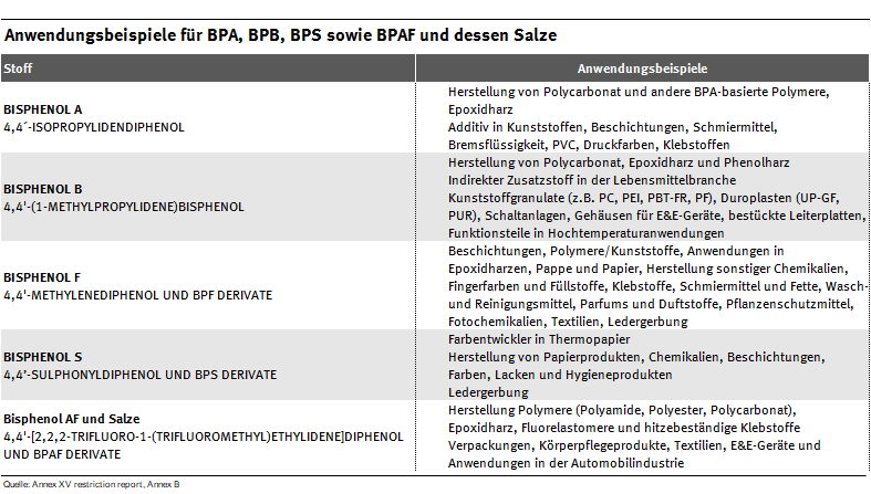 Der im Oktober 2022 bei der europäischen Chemikalienagentur (ECHA) eingereichte Vorschlag umfasst derzeit die Bisphenole BPA, BPB, BPS, BPF sowie BPAF und dessen Salze. In der EU darf BPA in einigen Produktgruppen wie Spielzeug, Baby-Trinkflaschen oder Thermopapier nicht oder kaum mehr eingesetzt werden. Dies hat dazu geführt, dass Bisphenole mit ähnlicher Funktionsweise, aber gleicher schädigender Wirkung für einige Verwendungszwecke als Ersatzstoff eingesetzt werden. So wird BPA in vielen Thermopapieren inzwischen durch BPS ersetzt. Um weitere sogenannte „bedauerliche Substitutionen“ zu verhindern, adressiert der Beschränkungsvorschlag daher im Ansatz die gesamte Stoffgruppe der Bisphenole, sofern diese endokrine Disruptoren sind. Sobald für ein Bisphenol hormonell wirksame und fortpflanzungsschädigende Eigenschaften auf Umweltorganismen durch wissenschaftliche Untersuchungen identifiziert werden, sollen diese über einen Erweiterungsmechanismus automatisch in die Beschränkung aufgenommen werden. Für die im Rahmen des Beschränkungsvorschlages nötige Beschreibung einer Besorgnis werden die WHO/IPCS-Kriterien für endokrine Disruptoren in der Umwelt herangezogen: