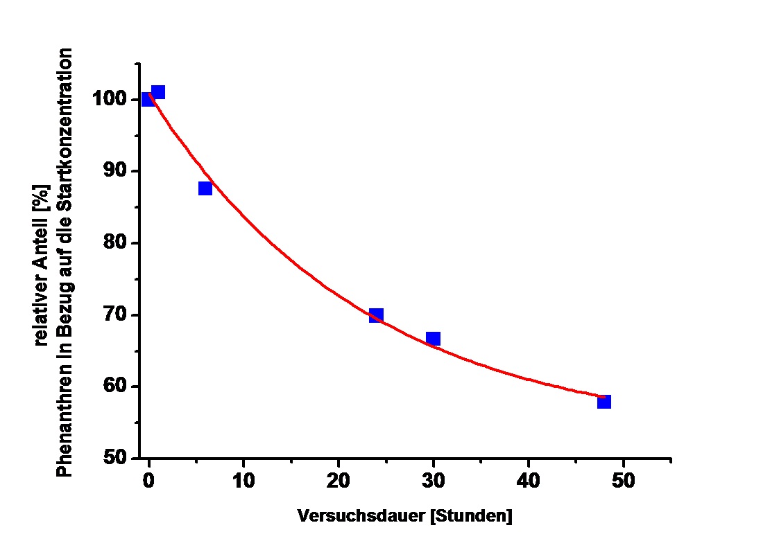 Die Abbildung zeigt die Abnahme der Phenanthrenkonzentration während des Versuches vom Start bis zum Ende nach 48 Stunden. Die Startkonzentration von 3,2 Mikrogramm pro Liter entspricht 100 Prozent. Nach 48 Stunden liegt die Konzentration in der wässrigen Lösung nur noch bei 58 Prozent, da sich Phenanthren in den Fischeiern angereichert hat. Unter Berücksichtigung des Durchmessers des Fischeis (1,25 Millimeter) und des Eidotters (0,75 Millimeter) wurde mittels eines Computer-Programms aus der Abnahmekurve ein BCF-Wert von 6300 für Phenanthren berechnet. Das ist ein vergleichbar hoher Wert, der eindeutig auf die Eigenschaft zur Bioakkumulation hinweist. Interessant ist jedoch, dass er sehr gut mit den in der Fachliteratur bekannten BCF-Werten übereinstimmt und ein vergleichbarer Wert von der kooperierenden Arbeitsgruppe im UFZ Leipzig ermittelt wurde. Diese Ergebnisse sind ein Hinweis darauf, dass dieses Verfahren eine Alternative zum oben genannten OECD-Test 305 sein könnte.