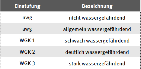 Stoffe und Gemische können eine Gefahr für Gewässer sein. Sie müssen deshalb entsprechend ihrer Gefährlichkeit in Wassergefährdungsklassen (WGK) – bzw. als „allgemein wassergefährdend“ oder „nicht wassergefährdend“ – eingestuft werden.