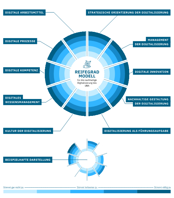 Dieses speziell für die Umweltverwaltung entwickelte Bewertungsinstrument hilft dabei, den digitalen Reifegrad einer Behörde im Sinne einer Eigenverortung systematisch zu erfassen, besprechbar zu machen und entlang der erreichten Reife auch weiterzuentwickeln. Es umfasst zehn Gestaltungsdimensionen - von der strategischen Orientierung über die Führung bis hin zu digitalen Innovationen. Anders als bestehende komplexere Modelle schaut es genau auf die Menschen und die Nachhaltigkeit. Dabei ist es niedrigschwellig anpassbar, leicht verständlich und gut bedienbar.