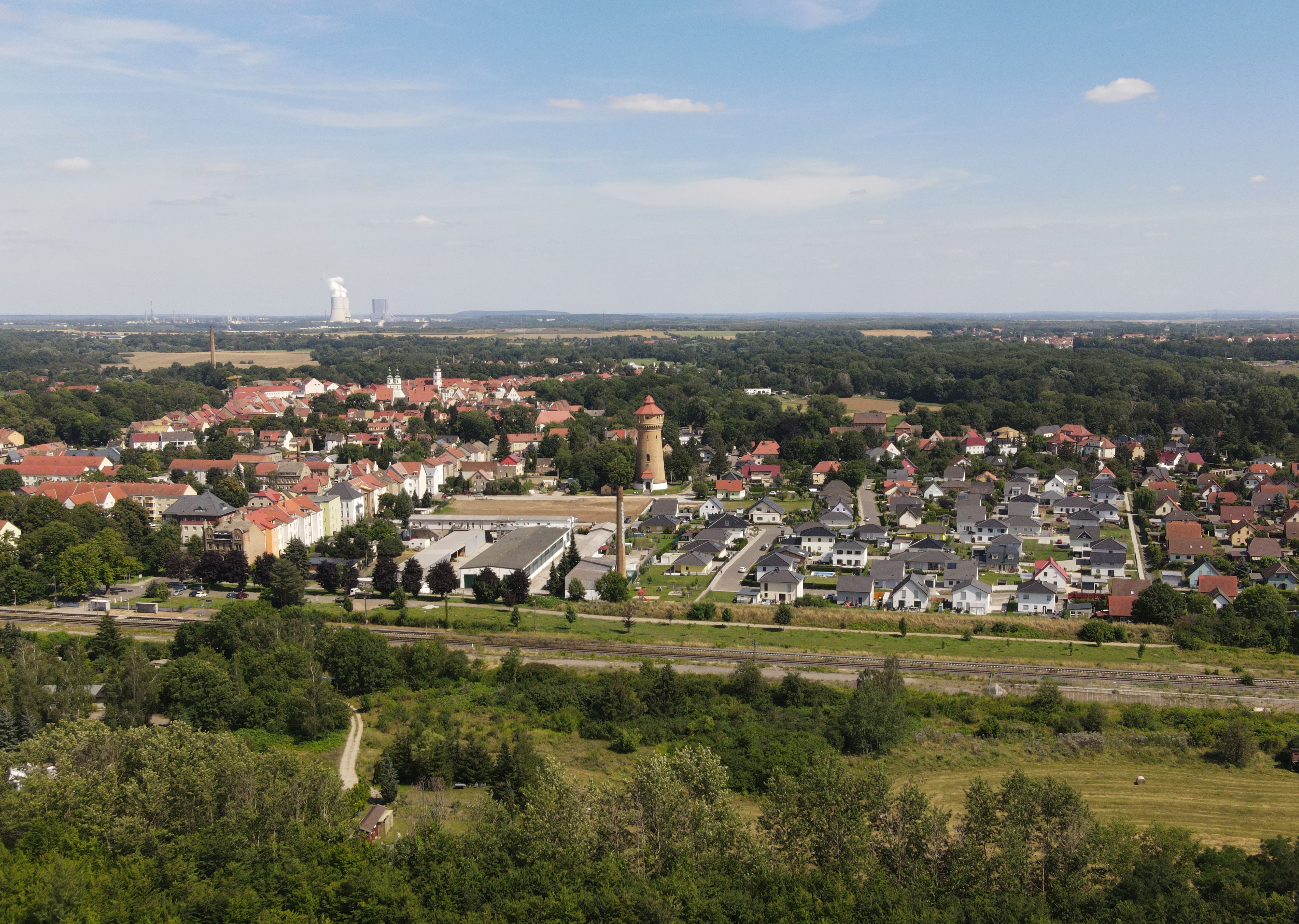 Luftbild mit Blick auf eine Siedlung und das Umland.