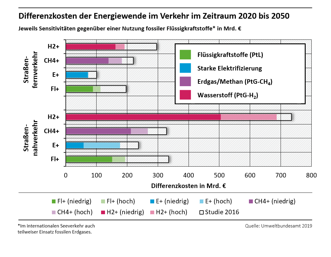 Berücksichtigt wurden in der Studie „Sensitivitäten zur Bewertung der Kosten verschiedener Energieversorgungsoptionen des Verkehrs bis zum Jahr 2050“ die Kosten für die Anschaffung der Fahrzeuge, den Aufbau der Tankstellen- und Ladeinfrastruktur sowie die Energiebereitstellung kumuliert für den gesamten Zeitraum von 2020 bis 2050. Es wurden alle Verkehrsmittel untersucht und die Mehrkosten gegenüber der Nutzung von fossilem Benzin, Diesel, Kerosin oder Schweröl ermittelt.