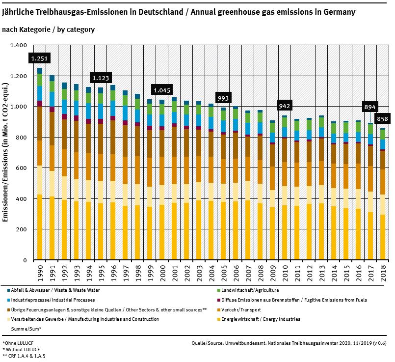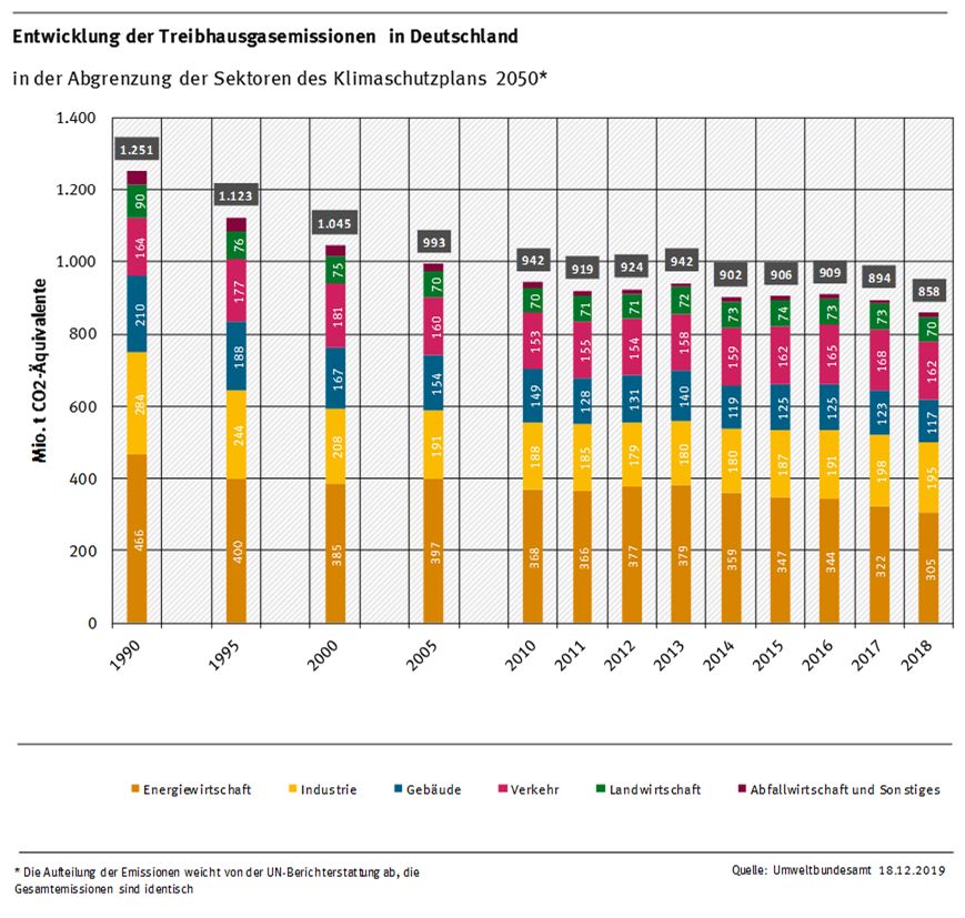 2018 wurden in Deutschland insgesamt 858,4 Millionen Tonnen CO2-Äquivalente ausgestoßen. Das sind 35,9 Millionen Tonnen bzw. 4 Prozent weniger als 2017 und 31,4 Prozent weniger im Vergleich mit 1990. Dies zeigen die Ergebnisse der Berechnungen, die das Umweltbundesamt (UBA) an die Europäische Kommission übermittelt hat. Am deutlichsten sind die Emissionen in der Energiewirtschaft zurückgegangen.