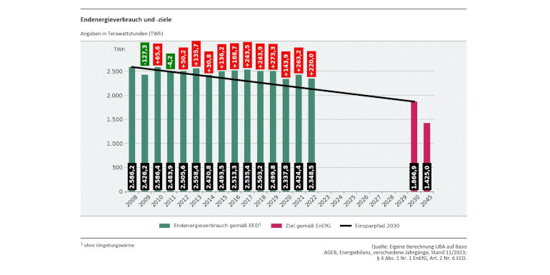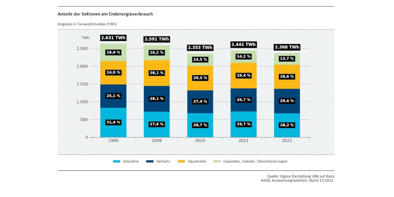 Ende des Jahres 2023 lagen die aktualisierten Daten zum Energieverbrauch für das Jahr 2022 vor. Die Überarbeitung der so genannten Auswertungstabellen der Arbeitsgemeinschaft Energiebilanzen e.V. (AGEB) bestätigt signifikante Energieverbrauchsminderungen, wie sie erste Analysen hatten vermuten lassen. Der Endenergieverbrauch (EEV) als wichtiger Indikator, an dem auch das Energieeffizienz-Ziel der Bundesregierung orientiert ist, ist 2022 insgesamt auf 2.368 Terawattstunden (TWh) und damit auf den zweitniedrigsten Stand seit 1990 beziehungsweise 2008 gefallen (gemäß Logik des deutschen Energieeffizienzgesetzes ohne Berücksichtigung der Umweltwärme auf 2.349 TWh). Die Energieeinsparung beträgt 3,0 Prozent gegenüber 2021 und 9,2 Prozent gegenüber 2008.