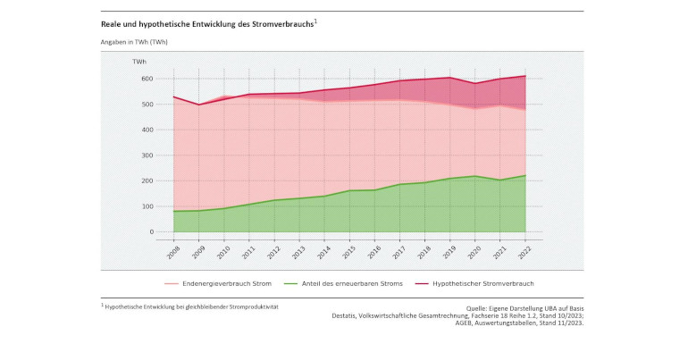 Die Energieproduktivität insgesamt hat also deutlich zugenommen. Schließlich hat die Minderung des Energieverbrauchs auch maßgeblich zur Erhöhung des Anteils der erneuerbaren Energien an der Stromerzeugung sowie zum Klimaschutz beigetragen – eingesparte Energie muss nicht fossil erzeugt werden. Ohne Energiesparen als erste Säule der Energiewende läge der Anteil des erneuerbaren Stroms im Jahr 2022 gegenüber dem Vorjahr um 1,5 Prozentpunkte niedriger, gegenüber einer hypothetischen Entwicklung ohne Energieverbrauchsrückgang seit 2008 sogar um 10 Prozentpunkte.