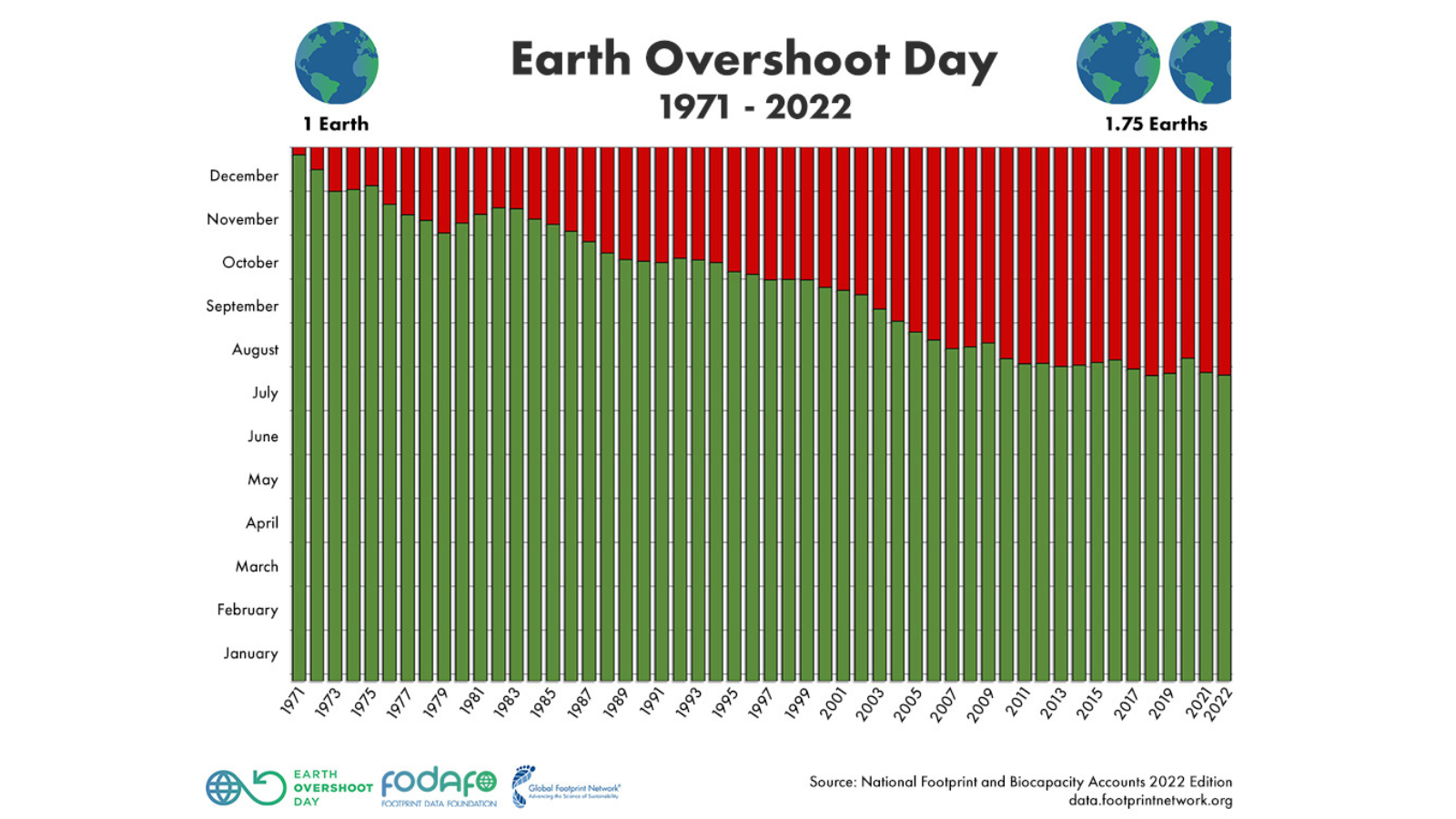 Die Organisation Global Footprint Network berechnet den Erdüberlastungstag (Earth Overshoot Day) mithilfe des ökologischen Fußabdrucks. Dieser ist ein ⁠Indikator⁠ für die Nutzung der biologischen Kapazität und Regenerationsfähigkeit und für die Auswirkungen menschlichen Handelns auf die Umwelt. Denn die Ressourcen auf der Erde sind endlich: Wir stoßen beispielsweise mehr Kohlendioxid aus, als Wälder und Ozeane absorbieren können, fischen intensiver als sich die Bestände erholen und fällen mehr Bäume als nachwachsen. Wird der Earth Overshoot Day am weltweiten durchschnittlichen Ressourcenbedarf bemessen, so fällt er in die zweite Augusthälfte, ist also zumindest deutlich später als der für den deutschen Bedarf berechnete Tag.