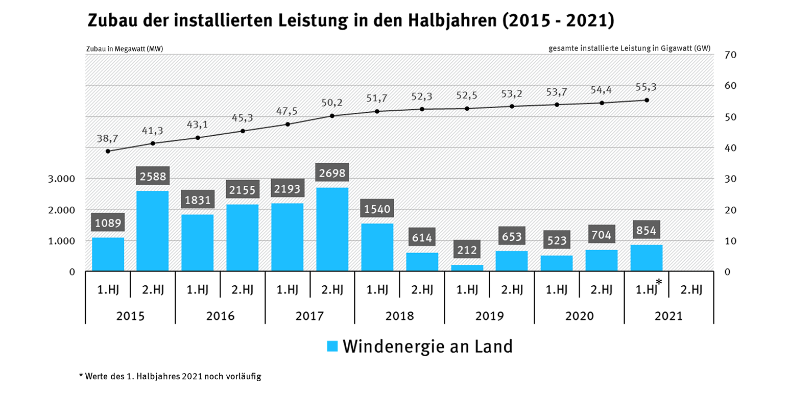 Der Netto-Zubau neuer Windkraftanlagen an Land zeigt im ersten Halbjahr 2021 mit etwa 854 Megawatt (MW) einen leicht positiven Trend. Das Niveau der neu installierten Leistung befindet sich aber weiter deutlich unter dem Niveau der ausbaustarken Jahre 2014 bis 2017. Die installierte Leistung stieg in den ersten sechs Monaten des Jahres von 54.420 MW um nur 1,5 Prozent auf 55.275 MW.