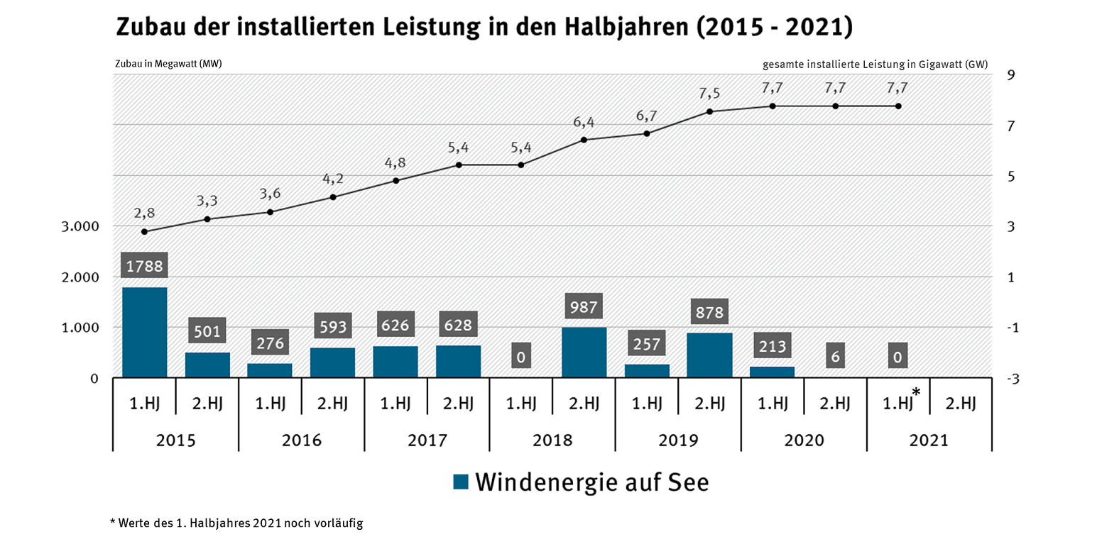 In den ersten sechs Monaten 2021 wurden in Deutschland insgesamt etwa 122 Milliarden Kilowattstunden (Mrd. kWh) Strom aus erneuerbaren Energien erzeugt. Dies entspricht einem Rückgang um über 10 Prozent gegenüber dem ersten Halbjahr 2020 (136 Mrd. kWh). Auch der Wert des ersten Halbjahres 2019 (127 Mrd. KWh) wurde verfehlt. Hauptgrund für diese Entwicklung war das sehr windarme Frühjahr. Zwar kam es auch in der Vergangenheit zu witterungsbedingten Schwankungen im Windangebot, diese Schwankungen konnten in früheren Jahren jedoch oft durch einen kontinuierlichen Zuwachs an neuen Windenergieanlagen ausgeglichen werden. Infolge des zuletzt sehr langsamen Zubaus von Windenergieanlagen an Land gelang dies im aktuellen Jahr nicht.
