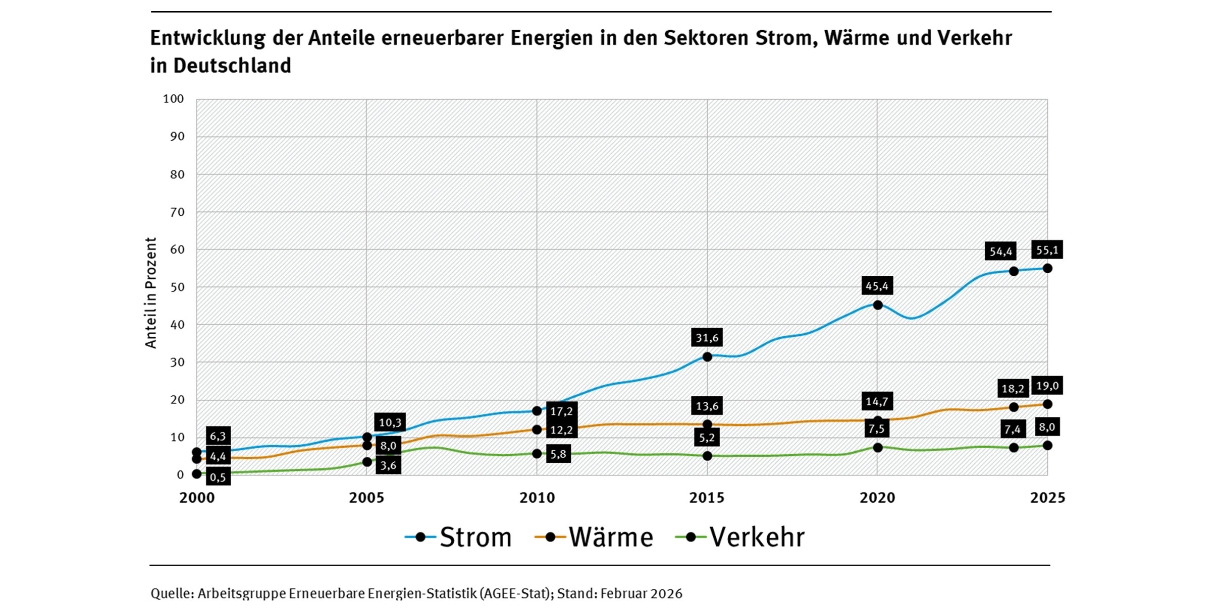 Nach aktuellen Auswertungen der Arbeitsgruppe Erneuerbare Energien-Statistik (AGEE-Stat) wurde im Jahr 2025 in Deutschland mit 290 Terawattstunden (TWh) rund ein Prozent mehr erneuerbarer Strom erzeugt als noch im Vorjahr. Bei leicht sinkender Stromnachfrage stieg der Anteil erneuerbarer Energien am Bruttostromverbrauch von 54,4 Prozent im Jahr 2024 auf 55,1 Prozent im Jahr 2025 an.