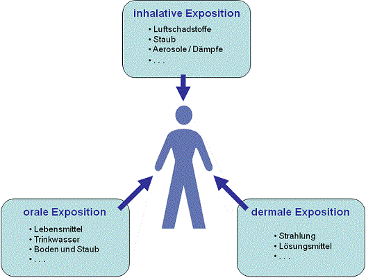 Die Exposition kann durch den Mund (zum Beispiel durch die Nahrung), über die Atemwege oder die Haut stattfinden. Die unterschiedlichen Aufnahmewege heißen „Expositionspfade”.