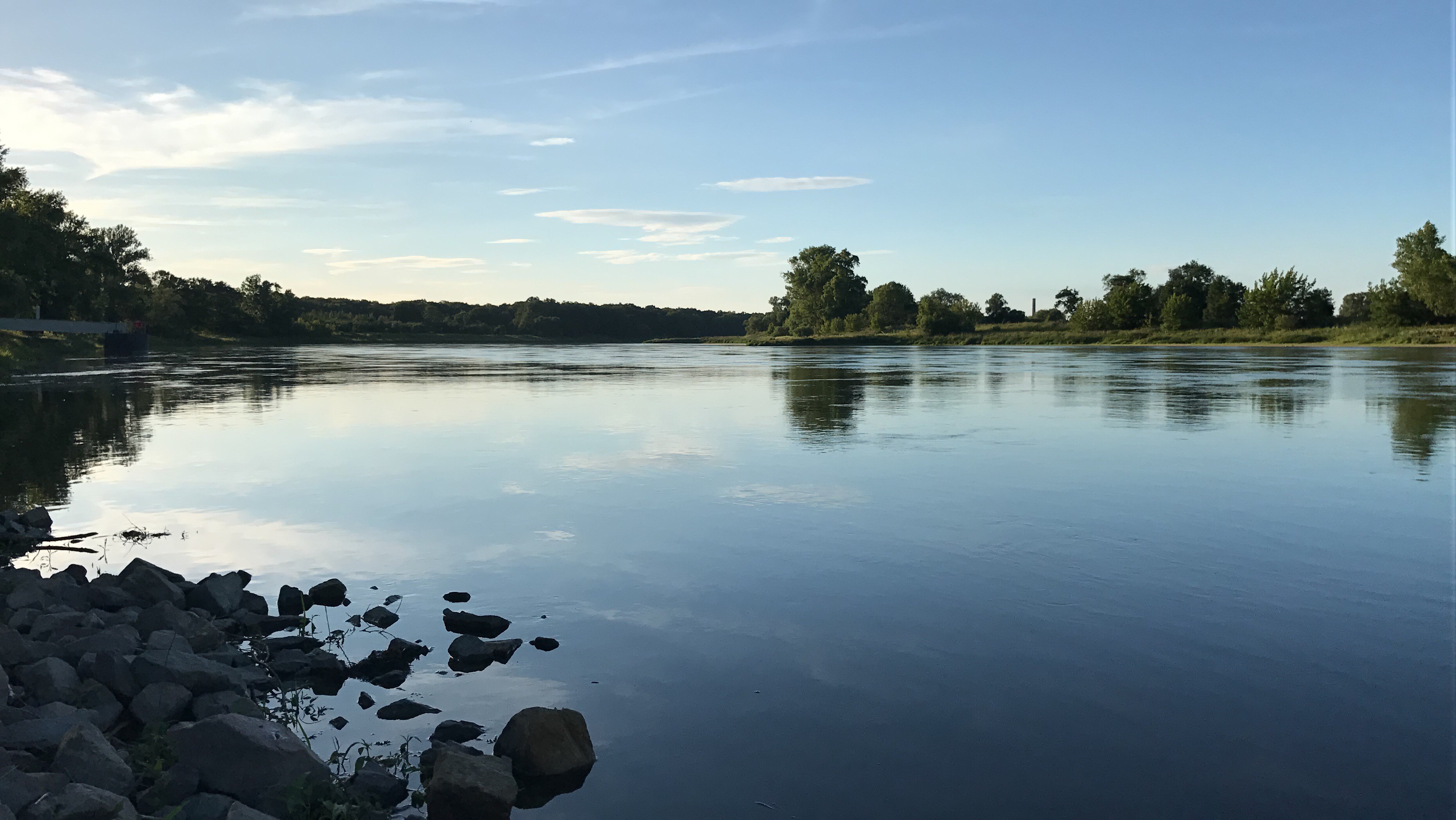 Der Fluss Elbe im Vordergrund mit Bäumen am Ufer und blauem Himmel.