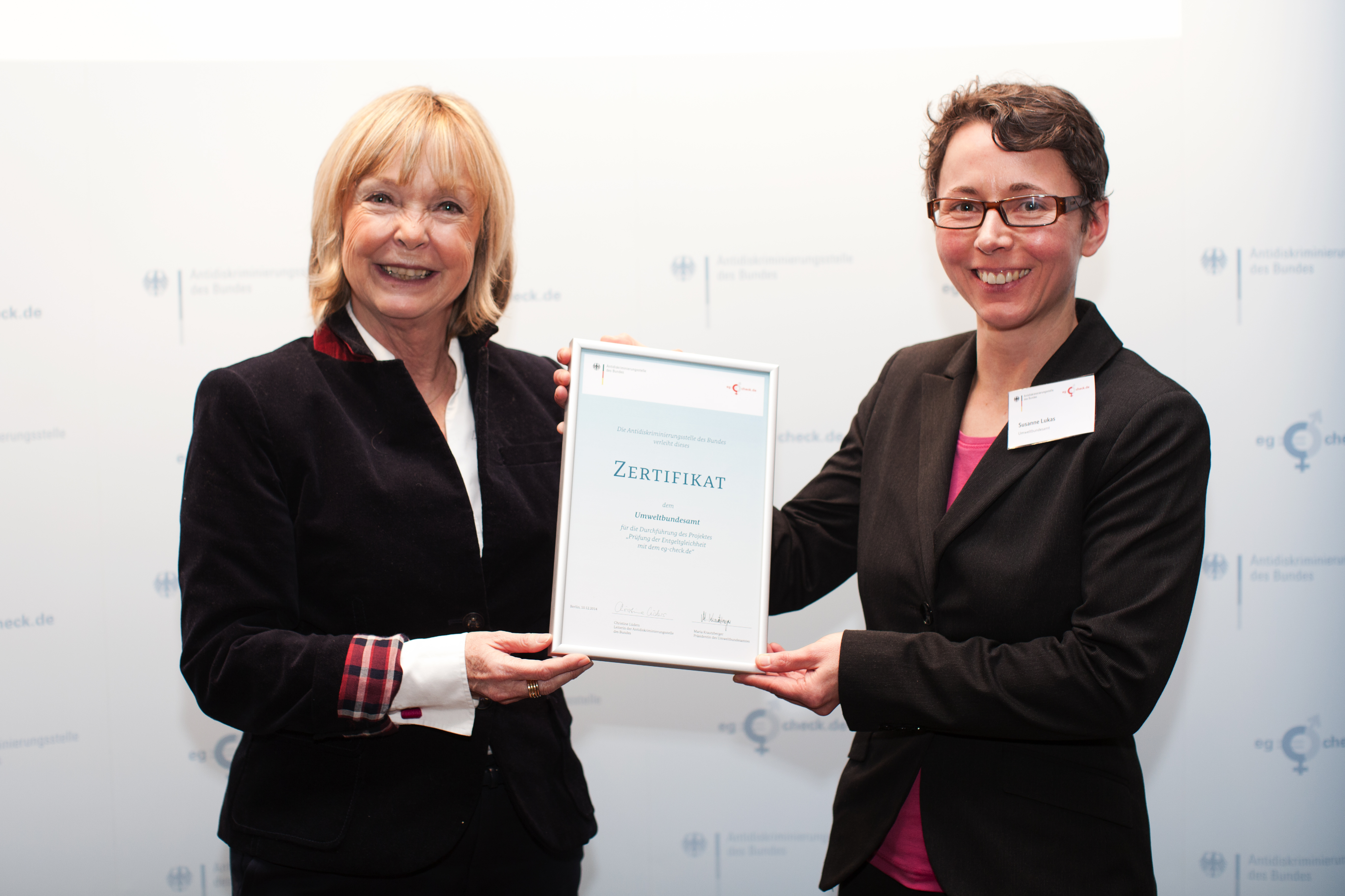 Werden Frauen und Männer bei vergleichbarer Arbeit und Leistung gleich bezahlt und bei der leistungsbezogenen Bezahlung gleich bewertet? Das UBA hat dies als erste Bundesbehörde für sich untersuchen lassen und wurde dafür mit einem Zertifikat der Antidiskriminierungsstelle des Bundes ausgezeichnet.