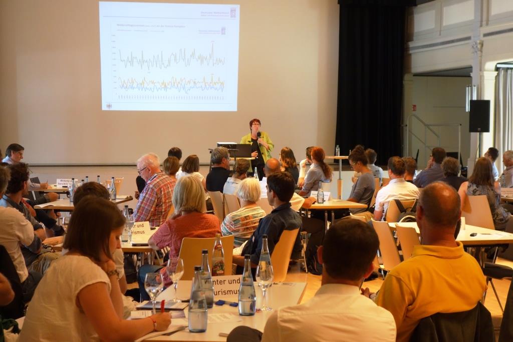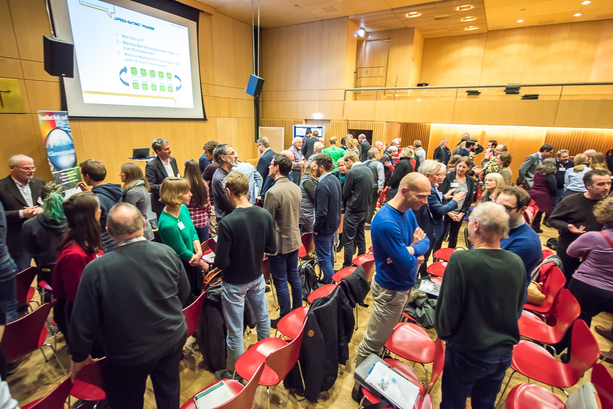 So vielfältig wie die Anpassungsmaßnahmen gestalten sich auch die Zielgruppen, die mit den Ideen- und Kooperationsbörsen erreicht werden sollen: Unternehmen, Kommunalverwaltungen, Bürgerinnen und Bürger, Vereine und Wissenschaftseinrichtungen aus der Region. Die Gruppe der Teilnehmenden ist daher heterogen. Vereinendes Element ist die Stadt oder Region, in der die Menschen leben und die spezifischen Anforderungen, die der Klimawandel vor Ort mit sich bringt. „Genau da haben wir mit unserem Konzept angesetzt“, erläutert IKU-Berater Lühr. Im Rahmen der Börsen stellten Vertreterinnen und Vertreter des Umweltbundesamts bzw. des Deutschen Wetterdienstes und der jeweiligen Kommunalverwaltungen die spezifischen Auswirkungen des Klimawandels in der Region dar – sowohl den Ist-Zustand als auch einen Blick in die Zukunft. Dadurch vermittelten sie persönliche Betroffenheit und weckten bei den Teilnehmenden das Eigeninteresse, etwas zu bewegen. „Uns war dabei aber wichtig“, betont Ebert, „kurz und übersichtlich über die regionalen Klimafolgen zu berichten.“ Anschließend sollten die Teilnehmenden selbst aktiv werden und diskutieren. „Wir wollten genug Zeit für die Börsensituation mit ihrem offenen Charakter für Austausch lassen.“ So diskutierten die Teilnehmenden an verschiedenen Thementischen. Angesprochen wurden im Allgäu etwa die Themen Winter & Tourismus, Hitze & Gesundheit, Wohnen & Bauen oder Land- & Forstwirtschaft. „Der Kern der Börsen ist, Akteure mit ganz unterschiedlichen Kompetenzen zusammenzubringen“, erklärt Lühr. Zum Beispiel: „Eine Kommune muss sich bei Hochwasser wappnen, hat aber nicht genug Helfer. Der Kreissportbund hat ausreichend Mitglieder, aber keine Ahnung vom Katastrophenschutz“, erklärt Lühr. „Eine Kooperationsbörse kann für solche verschiedenen Akteure einen Raum eröffnen, Projekte zu entwickeln, die sonst in der Art nicht zustande gekommen wären.“ Neben Projektideen zur Klimaanpassung wurden in den Diskussionen auch hin und wieder Ideen zu Klimaschutz und Energie oder allgemein zu Nachhaltigkeit aufgebracht. Schließlich liegt in der Betrachtung der Teilnehmenden vor Ort und in der angedachten Umsetzung der Projekte vieles nah beieinander. Und anfangs braucht es zudem viel Offenheit, damit die Teilnehmenden sich vernetzen.