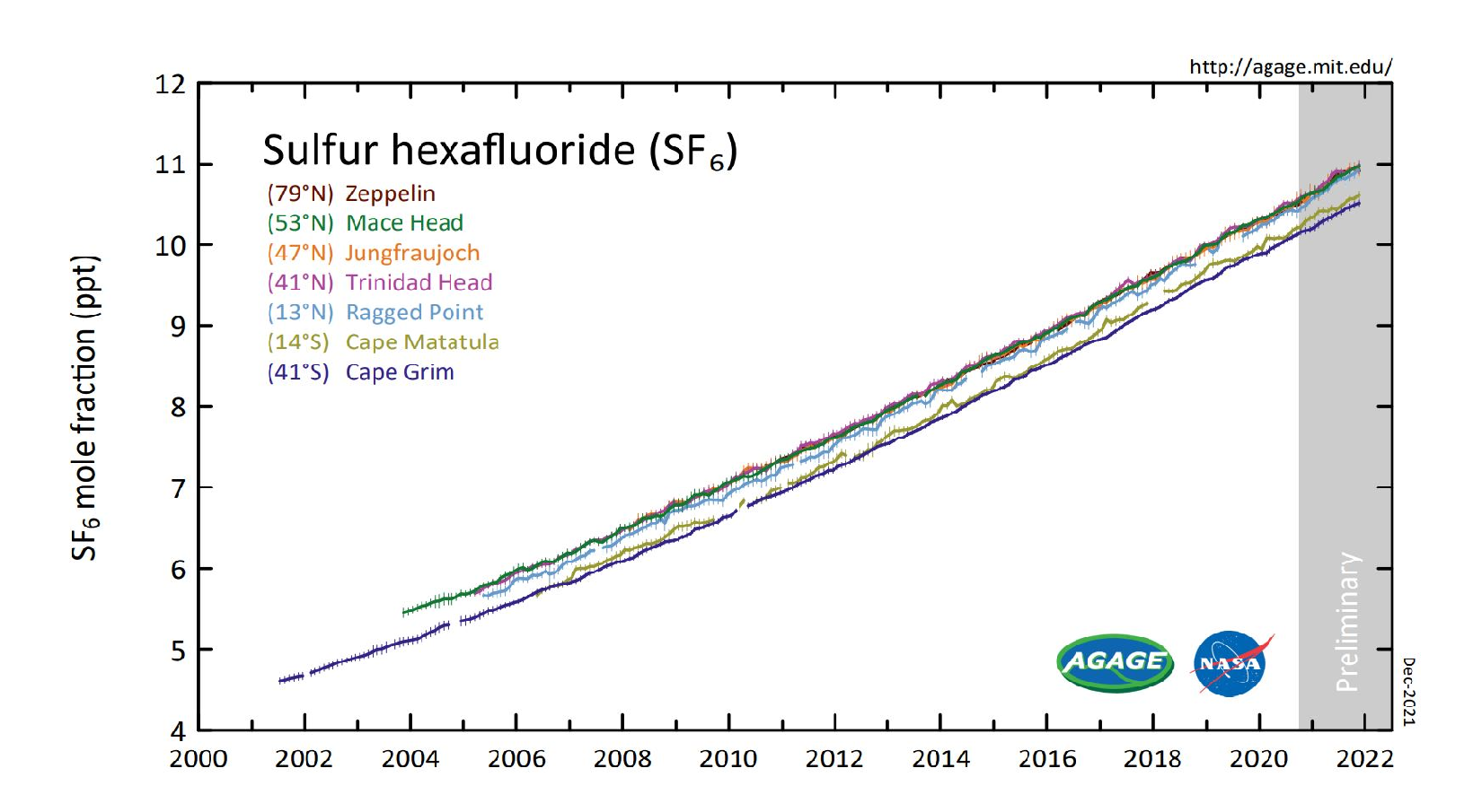 Aufgrund der Stabilität von SF6 steigen die Konzentrationen in der Atmosphäre kontinuierlich.