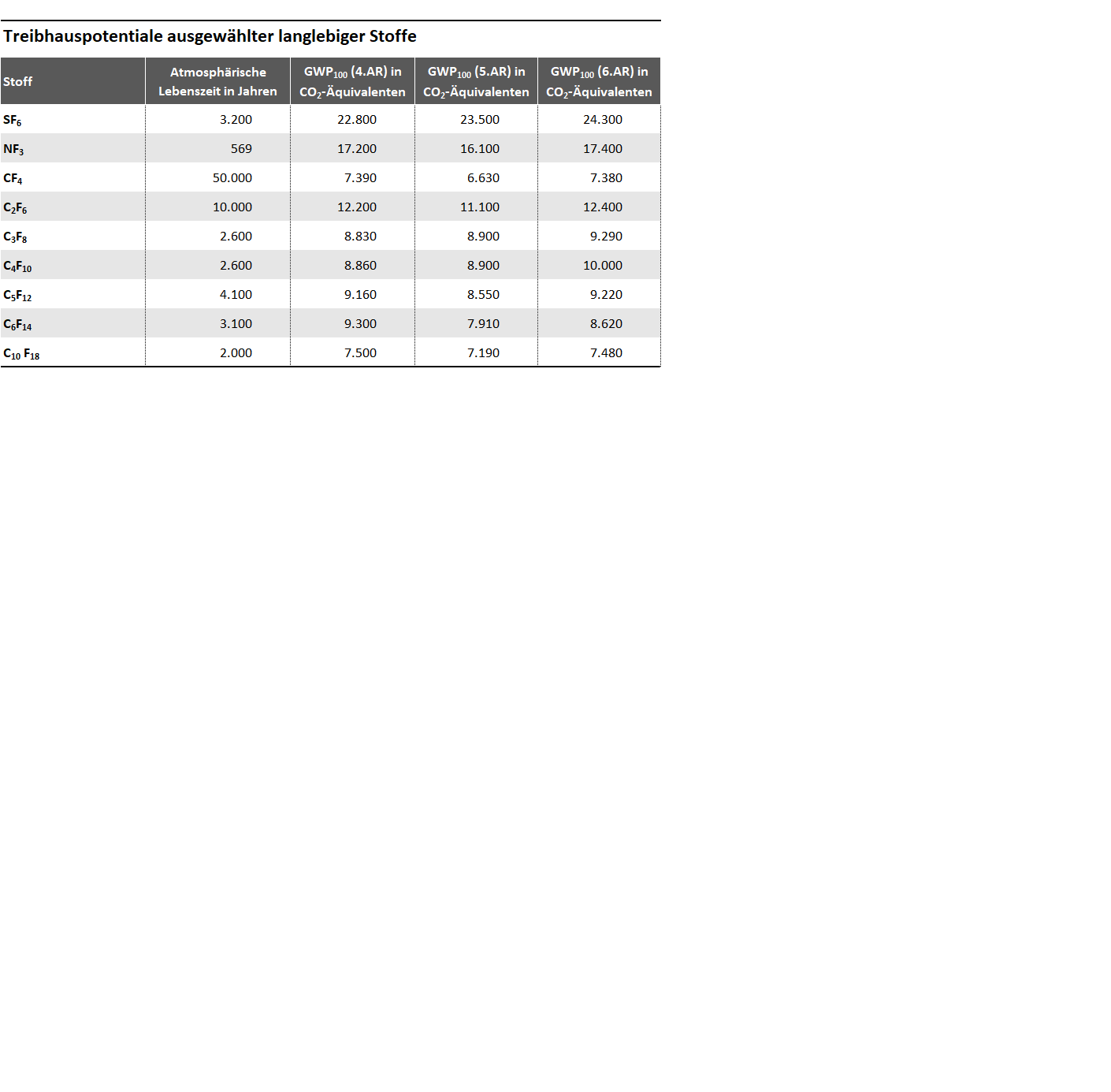 Langlebige fluorierte Treibhausgase zeichnen sich durch eine lange atmosphärische Verweildauer und ein Treibhauspotential deutlich über 5000 CO2-Äquivalenten aus. Sie werden nicht in überschaubaren Zeiträumen abgebaut, sondern reichern sich in der Atmosphäre an. Neben Schwefelhexafluorid (SF6) gehören Stickstofftrifluorid (NF3) und vollfluorierte Kohlenwasserstoffe, wie CF4 und C2F6, zu dieser Stoffgruppe.