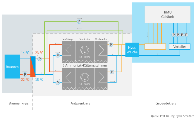 Sechs Bundesministerien haben ihren Hauptsitz in Bonn. Eines von ihnen ist das Bundesministerium für Umwelt, Naturschutz, nukleare Sicherheit und Verbraucherschutz (BMUV). Untergebracht ist der erste Dienstsitz des Ministeriums in einem in den 80er Jahren errichteten Bürogebäude. Dieses wurde ab 2012 saniert und in diesem Zuge auch mit einer neuen Kältezentrale ausgestattet. Die nun in der Tiefgarage arbeitende Kältezentrale umfasst Kältemaschinen, Schaltschränke und Anlagenkomponenten zur Freikühlung. Sie nutzt das natürliche Kältemittel Ammoniak (R-717) – und Brunnenwasser.