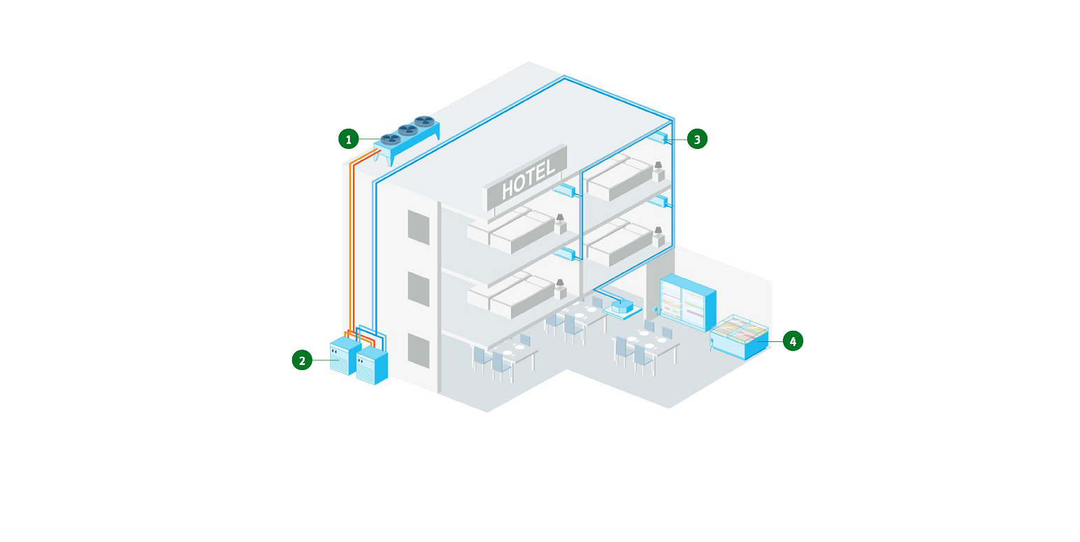 ModellKleines Hotel (ca. 20 Betten)KältetechnikIndirekte Systeme mit FlüssigkeitskühlsätzenKältemittelPropan (R-290)