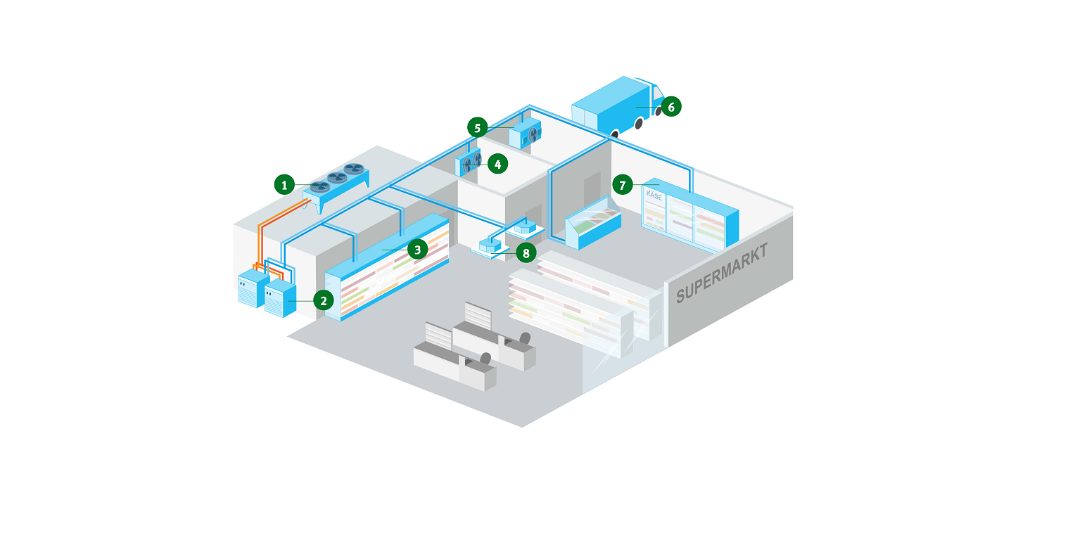 Die Kühlung verderblicher Waren beim Transport, angenehm temperierte Verkaufsräume, sowie Normal- und Tiefkühlung im Markt. Die Supermarktkältetechnik vereint viele, verschiedene Herausforderungen, die auch mit natürlichen Kältemitteln realisiert werden. Ob Propan oder CO2 die effizienteste Wahl als Kältemittel ist, hängt von verschiedenen Randbedingungen ab. Die Beratung durch einen Experten ist deshalb notwendig.