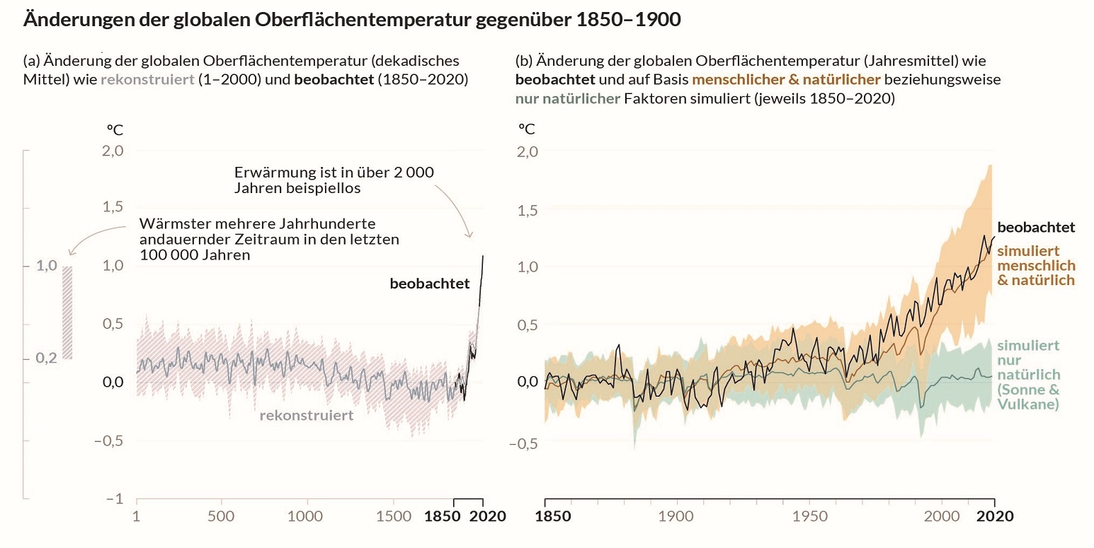 In Folge der global zunehmenden Treibhausgaskonzentration in der Atmosphäre war jedes der letzten vier Jahrzehnte seit 1980 aufeinanderfolgend wärmer als jedes vorherige Jahrzehnt seit 1850. In den ersten beiden Dekaden des 21. Jahrhunderts war die globale Oberflächentemperatur im Mittel um 0,99°C höher als im Zeitraum 1850-1900. Dabei war der Temperaturanstieg über Land mit 1,59 °C im Mittel größer als über dem Meer (0,88 °C). Die wahrscheinliche Spanne des gesamten vom Menschen verursachten Anstiegs der globalen Oberflächentemperatur von 1850-1900 bis 2010-2019 beträgt 0,8°C bis 1,3°C (Abbildung 1). (Quelle des Abschnitts: AR6, Teilbericht (WG) I, Summary for Policymaker (SPM) Kapitel A.1)