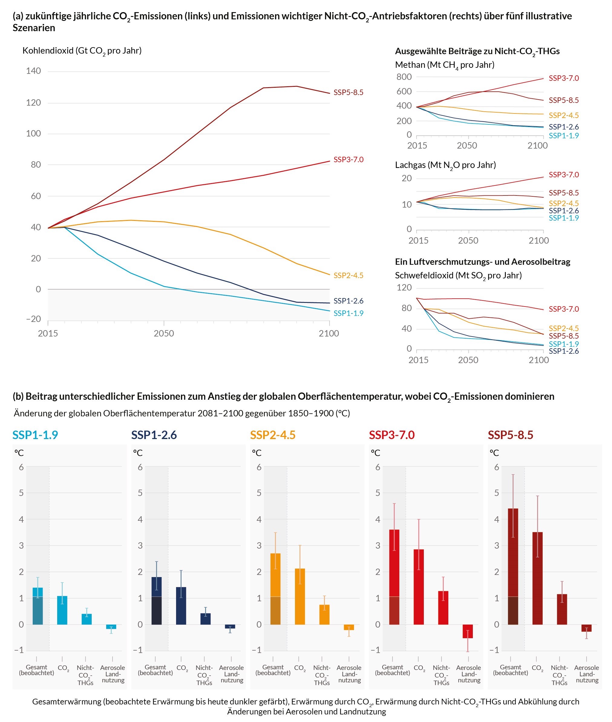 Um die gesamte Bandbreite der möglichen zukünftigen Veränderungen des Klimasystems zu erfassen, wurden im Rahmen des AR6, die „Gemeinsam genutzten sozioökonomischen Pfade“ (engl. Shared Socioeconomic Pathways, SSPs) mit den „Repräsentativen Konzentrationspfaden“ (engl. Representative Concentration Pathways, RCPs) kombiniert. Dabei handelt es sich um fünf unterschiedliche illustrative Szenarien möglicher sozioökonomischer globaler Veränderungen bis zum Jahr 2100, welche zur Ableitung von Szenarien für globale Treibhausgasemissionen als Folge unterschiedlicher klimapolitischer Maßnahmen verwendet werden. SSP5-8.5 und SSP3-7.0 bezeichnen Szenarien mit sehr hohen beziehungsweise hohen weltweiten Treibhausgas-(THG-) Emissionen, bei denen sich die Emissionen bis zur Mitte respektive bis Ende des Jahrhunderts verdoppeln. Im mittleren Szenario (SSP2-4.5) stagnieren die CO2-Emissionen bis zur Mitte des Jahrhunderts auf dem heutigen Niveau. Lediglich im Falle der Szenarien mit niedrigen und sehr niedrigen THG-Emissionen (SSP1-2.6 und SSP1-1.9) gelingt die Reduktion auf Netto-Null kurz nach oder bis 2050 und verbleibt danach dauerhaft auf diesem Niveau. Das Ziel „Netto-Null CO2-Emissionen“ bedeutet in diesem Fall, dass alle durch die Menschen verursachten CO2-Emissionen im gleichen Zeitraum über technologische CO2-Entnahmemaßnahmen (Carbon Dioxide Removal – CDR) wieder aus der Atmosphäre entfernt werden. Die gravierenden Unterschiede der fünf wesentlichsten Einzelszenarien ergeben sich aus verschiedenen sozioökonomischen Entwicklungsszenarien und weltweiten Klimaschutzmaßnahmen sowie aus den unterschiedlichen Szenarien für den menschengemachten Gesamtstrahlungsantrieb (engl.: Radiative forcing) seit der vorindustriellen Zeit (1850–1900). Dieser bezeichnet ein Maß für die Änderung der Energiebilanz der Erde (ausgedrückt in W/m²) aufgrund einer Änderung eines externen Treibers des Klimawandels, wie z. B. einer Änderung der Konzentration von Kohlendioxid (CO2), der Konzentration von Aerosolen oder die Leistung der Sonne. Abhängig von den weltweiten THG-Emissionen fallen somit auch die projizierten Veränderungen im Klimasystem unterschiedlich gravierend aus. Die beschriebenen Emissionsszenarien sind in Abbildung 2 dargestellt. (Quelle des Abschnitts: AR6, WG I, SPM Kapitel B.1)