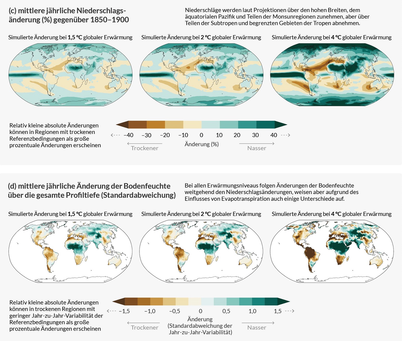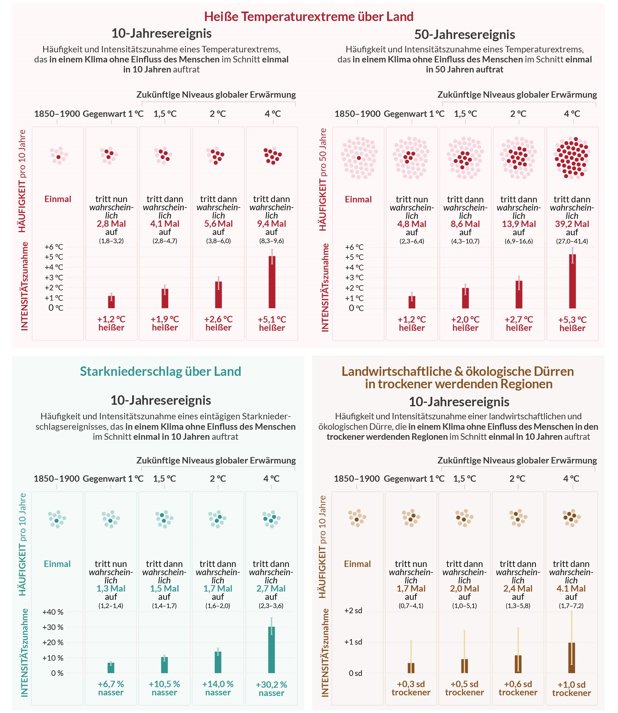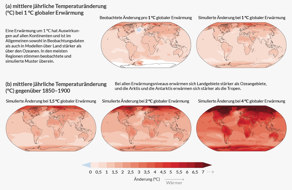 Viele Dynamiken im Klimasystem werden sich in direktem Zusammenhang mit der zunehmenden globalen Erwärmung beschleunigen. Beispielsweise werden die Häufigkeit und die Intensität extremer Hitzeperioden, mariner Hitzewellen (über Tage bis Monate erhöhte Meerestemperatur), starker Niederschläge und, in einigen Regionen, landwirtschaftlicher und ökologischer Dürreperioden zunehmen. Weiterhin werden sich intensive tropische Wirbelstürme häufen, während das arktische Meereis, die Schneebedeckung und die Ausbreitung des Permafrostes eine rückläufige Entwicklung zeigen werden. Die globale Erwärmung führt auch zur Intensivierung des Wasserkreislaufs, einschließlich seiner Variabilität. Als Resultat ist mit einer Intensivierung der globalen Monsun-Niederschläge sowie von Regen- und Trockenperioden zu rechnen. Mit jeder noch so geringen Erwärmung verstärken sich diese Dynamiken. Der Einfluss der Erderwärmung auf besagte Dynamiken kann mithilfe der Abbildungen 4 und 5 nachvollzogen werden.