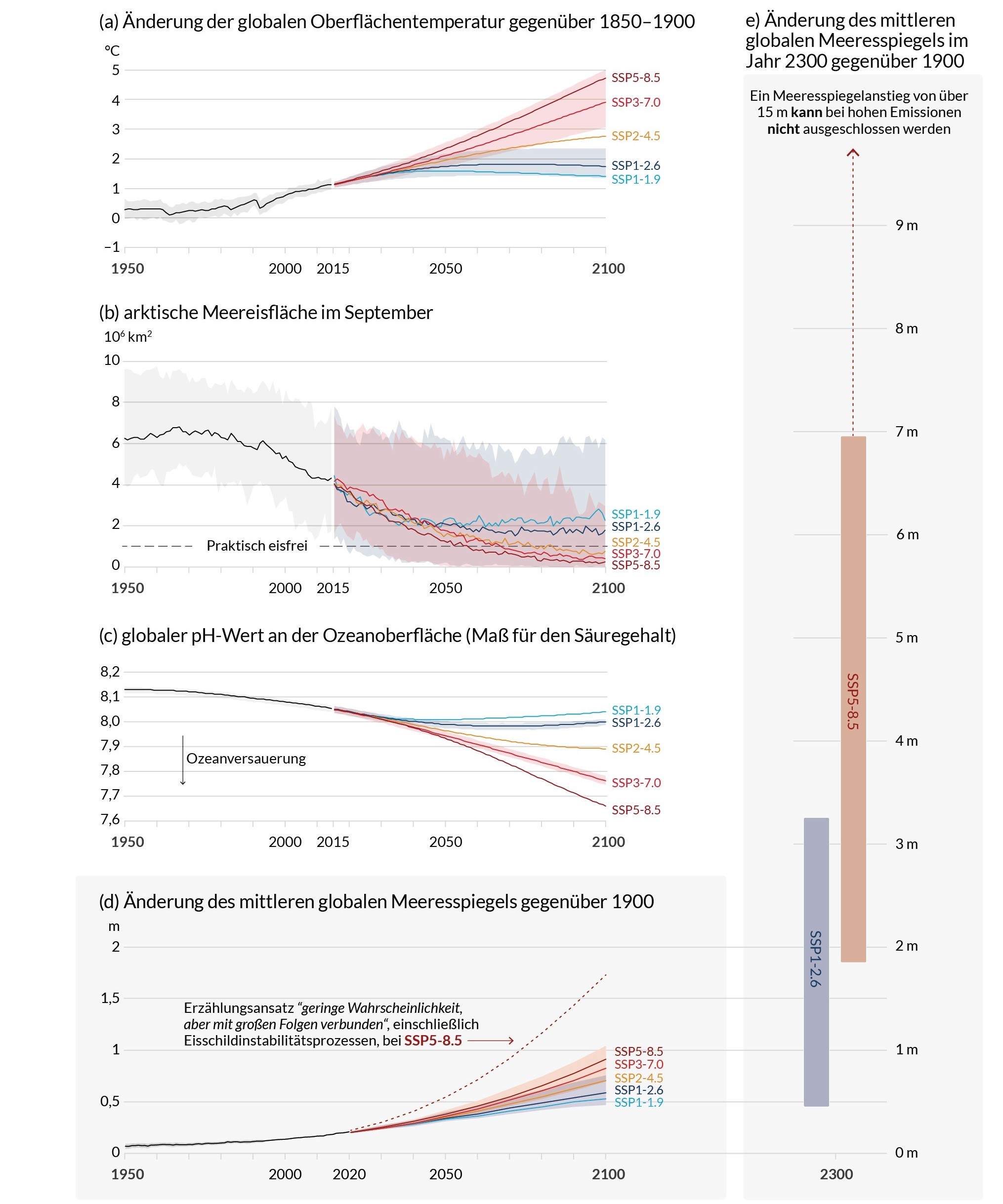 Auch der Meeresspiegel wird im 21. Jahrhundert weiter ansteigen. Bis zum Jahr 2100 wird ein mittlerer globaler Meeresspiegelanstieg von 0,28 – 0,55 m im SSP1-1.9, von 0,44 – 0,76 m im SSP2-4.5 und von 0,63 – 1,01 m im SSP5-8.5 im Vergleich zum Zeitraum 1995-2014 projiziert. Längerfristig wird der Meeresspiegel aufgrund der anhaltenden Erwärmung der Tiefsee und des Abschmelzens der Eisschilde für Jahrhunderte bis Jahrtausende ansteigen und für Tausende von Jahren erhöht bleiben. Einige der beschriebenen Trends sind in Abbildung 6 visualisiert. (Quellen des Abschnitts: AR6, WGI, SPM Kapitel B.3 bis B.5)