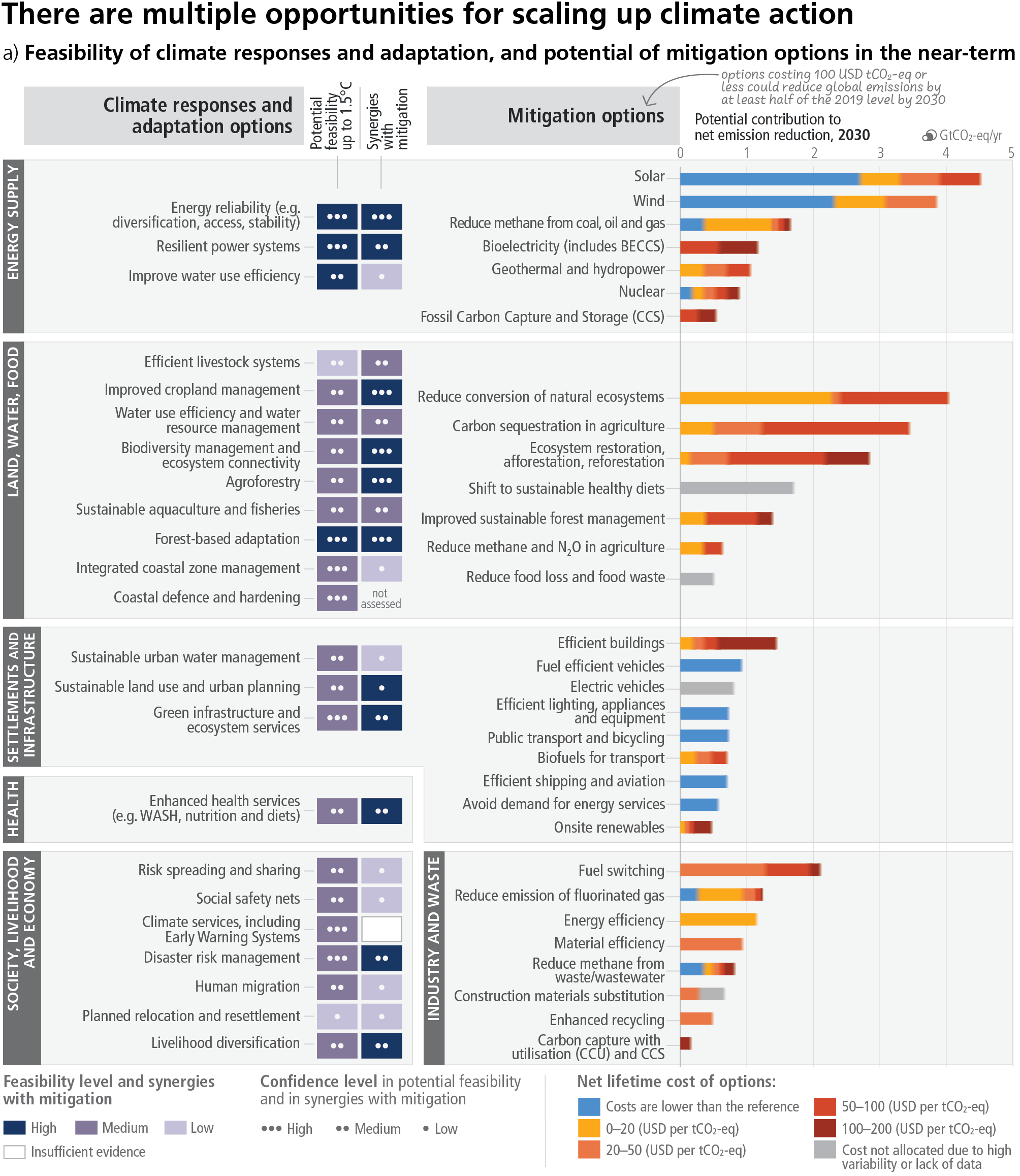 Zur Reduktion der THG-Emissionen im gesamten Energiesektor sind große Veränderungen erforderlich, einschließlich einer erheblichen Verringerung des Gesamtverbrauchs an fossilen Brennstoffen, des Einsatzes emissionsarmer Energiequellen, der Umstellung auf alternative Energieträger sowie der Energieeffizienz und Energiesuffizienz. CDR wird benötigt, um die Restemissionen im Energiesektor auszugleichen. Kostensenkungen bei den Schlüsseltechnologien, insbesondere bei der Windkraft, der Solarenergie und der Speicherung, haben die wirtschaftliche Attraktivität der Überleitung zu einem emissionsarmen Energiesektor bis 2030 erhöht. Von 2010 bis 2019 sind die Kosten für Solarenergie, Windenergie und Lithium-Ionen-Batterien nachhaltig gesunken, und ihr Einsatz hat stark zugenommen. Elektrizitätssysteme die primär aus erneuerbaren Energien gespeiste werden sind zunehmend rentabel. Eine ganzheitliche Energieversorgung aus erneuerbaren Quellen stellt jedoch immer noch die größte Herausforderung dar. (Quelle des Abschnittes: AR6, WGIII, SPM Kapitel C.4)