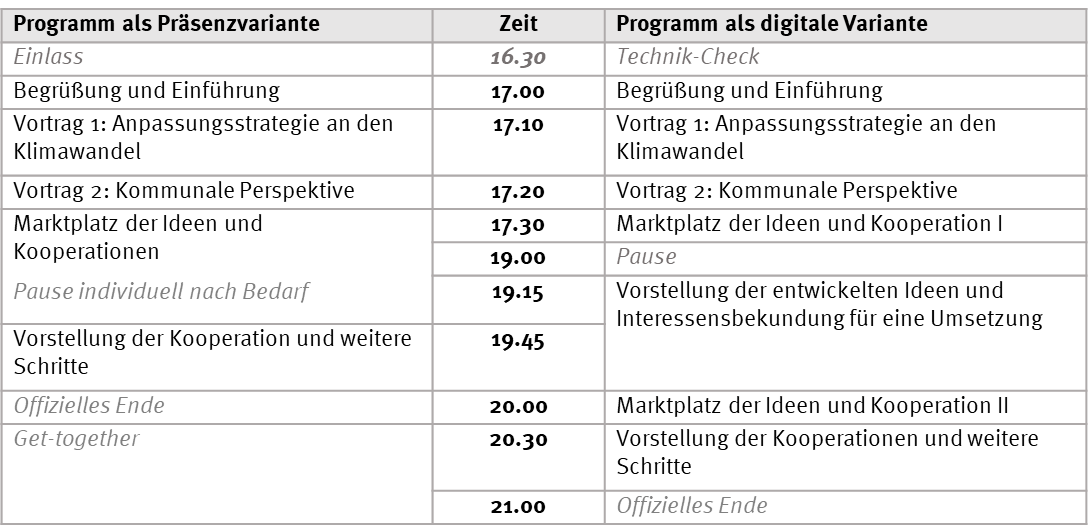 Die Ideen- und Kooperationsbörse dauert etwa 3 ½ bis vier Stunden und ist in zwei Phasen unterteilt. In einer ersten Informationsphase werden die Teilnehmer*innen durch Vorträge und Interviews in das Thema Anpassung an den Klimawandel eingeführt. In der zweiten Phase, dem „Marktplatz“, sind die Teilnehmer*innen dann selbst gefragt. Nach einer Kennenlernrunde ist der Raum offen und die Suche nach Projektpartner*innen kann beginnen.