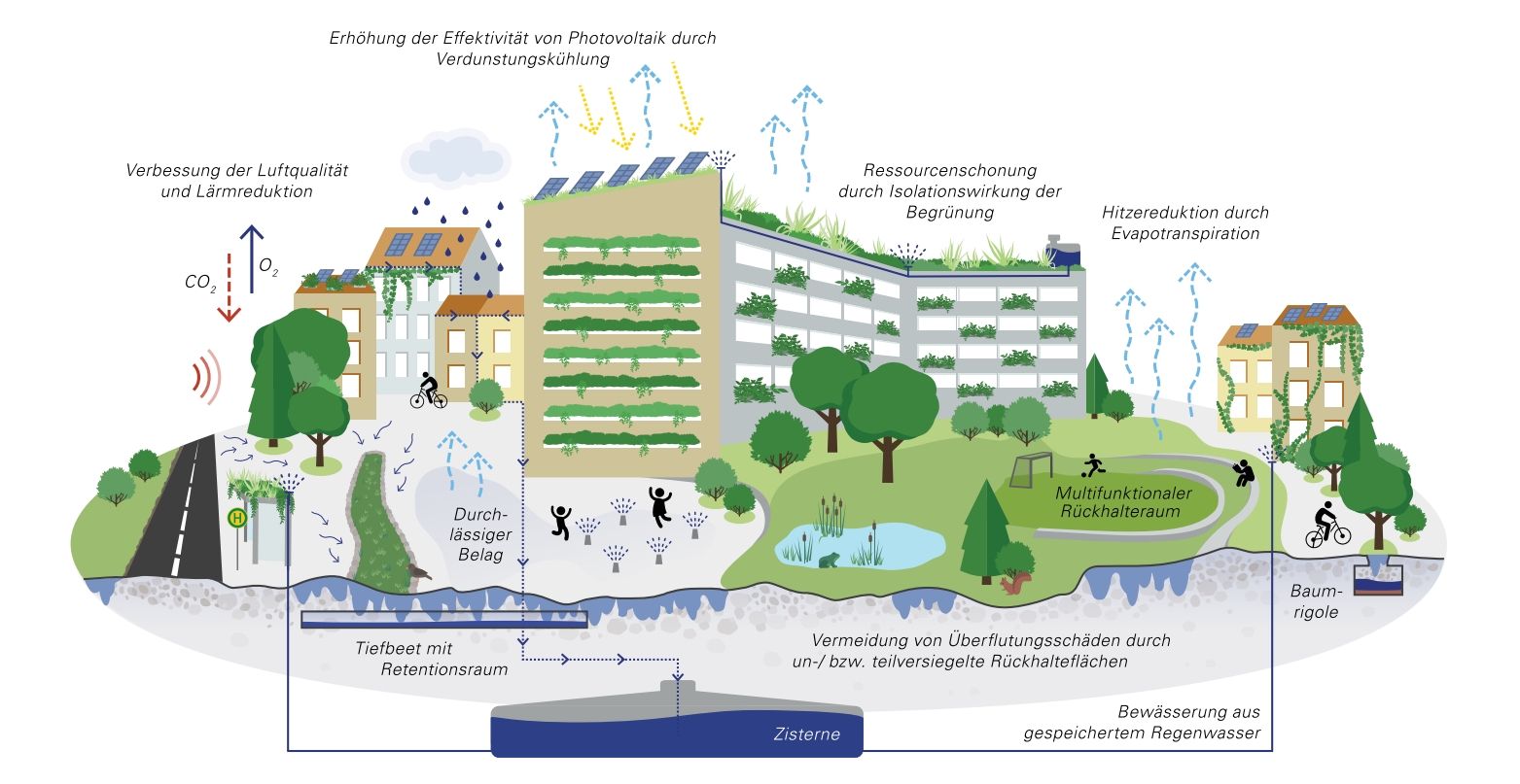 Das Pflanzen von Stadtbäumen und anderen Gehölzen entlang von Straßen, auf Plätzen und Parkplätzen hilft, den Regenwasserabfluss bei Starkregen zu verringern. Das Rückhaltevermögen hängt von der Anzahl, Dichte, Größe, Art und Anordnung der Bäume ab. Stadtbäume speichern zudem Kohlenstoff (u. a. abhängig von Art, Alter und offenem Boden), verbessern die Luftqualität und beeinflussen das Mikroklima positiv. Sie spenden Schatten, senken die Lufttemperatur und mindern so den Hitzeinseleffekt.