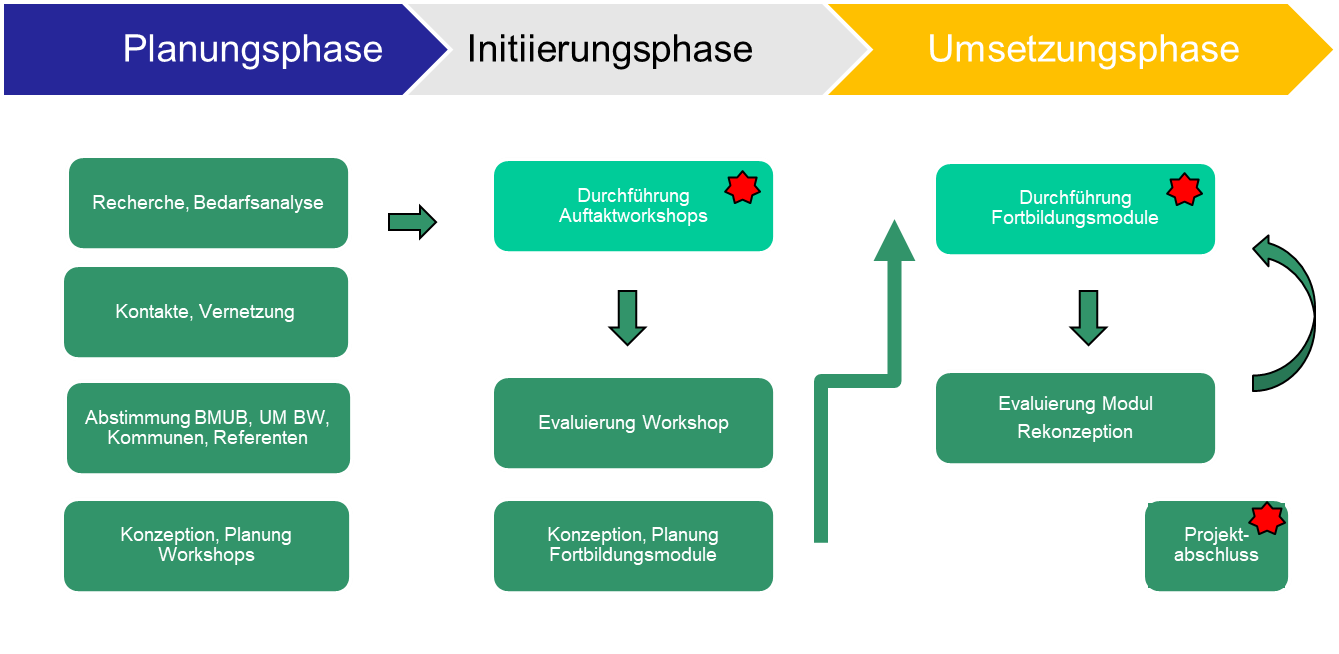 Durchgeführt wurden, neben zwei Startworkshops zur Vorstellung des Projektes und zur Etablierung des Themas „Klimaanpassung“, Seminare im Kontext der Klimaanpassung zu den Themen "Bürgerbeteiligung & Kommunikation", "Integration von Klimaschutz und Klimaanpassung", "Erfolgreiche Ansätze in der Stadtplanung, Grünflächen- und Freiraumplanung" sowie zum "Baugesetzbuch als Ausgangspunkt zur rechtlichen Verankerung von Klimaanpassung in der Stadtplanung".