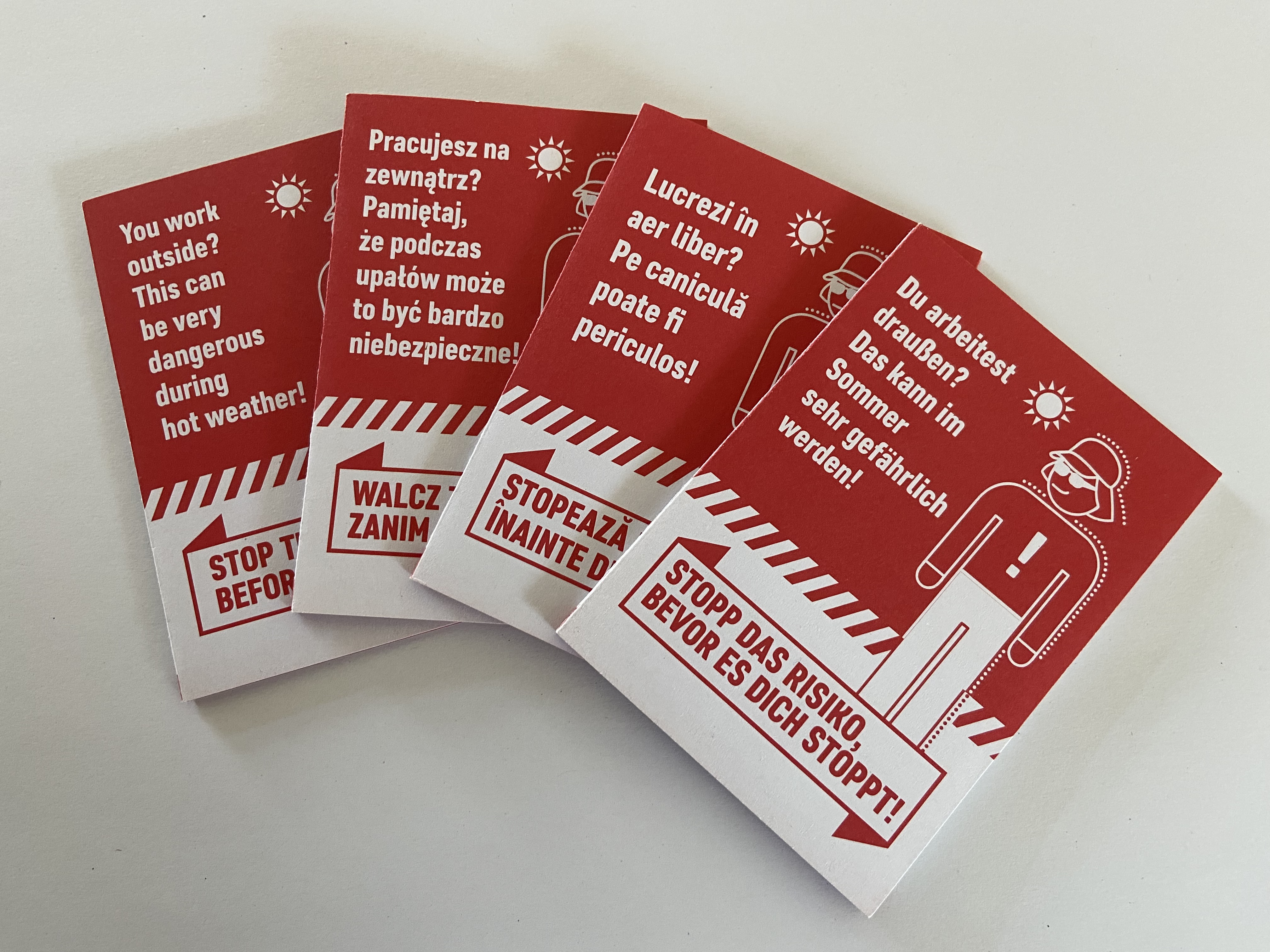 Dafür wurden passgenaue Bildungsbausteine und Informationsmaterialien zu den verschiedenen Gefährdungsbereichen als print und digitale Produkte entwickelt. Anschließend wurden diese Bildungsmaterialien mit Multiplikatoren pilothaft erprobt. Die Erprobungen und Unterweisungen erfolgten bei Extra-Schulungen wie zum Beispiel bei den Berater*innen des Europäischen Wanderarbeitervereins aber unter anderem auch bei Veranstaltungen wie Betriebsräteschulungen, Bundesfachgruppenkonferenz der IG BAU oder den Winterschulungen der Landwirtschaftskammer Niedersachsen. Die so geschulten haupt- und ehrenamtlichen Funktionäre und Berater wurden dadurch befähigt, die Beschäftigten auf den Feldern und Baustellen effizienter zu den Gefährdungen durch den Klimawandel und über ihre Gesundheitsbeeinträchtigungen zu informieren. Die Informationen erfolgten sowohl interpersonal, mit Hilfe von Print-Flyern als auch mittels Social-Media-Kanäle.