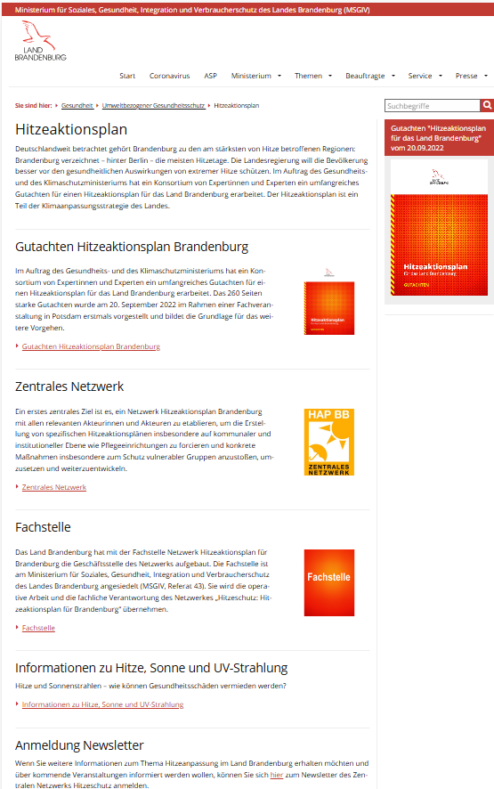 Durch die stetige Aktualisierung und Pflege der ministeriellen Webseite informiert diese nun die breite Bevölkerung gebündelt über Gefahren, Schutzmaßnahmen und Bestrebungen des Landes Brandenburg im Bereich Hitze.