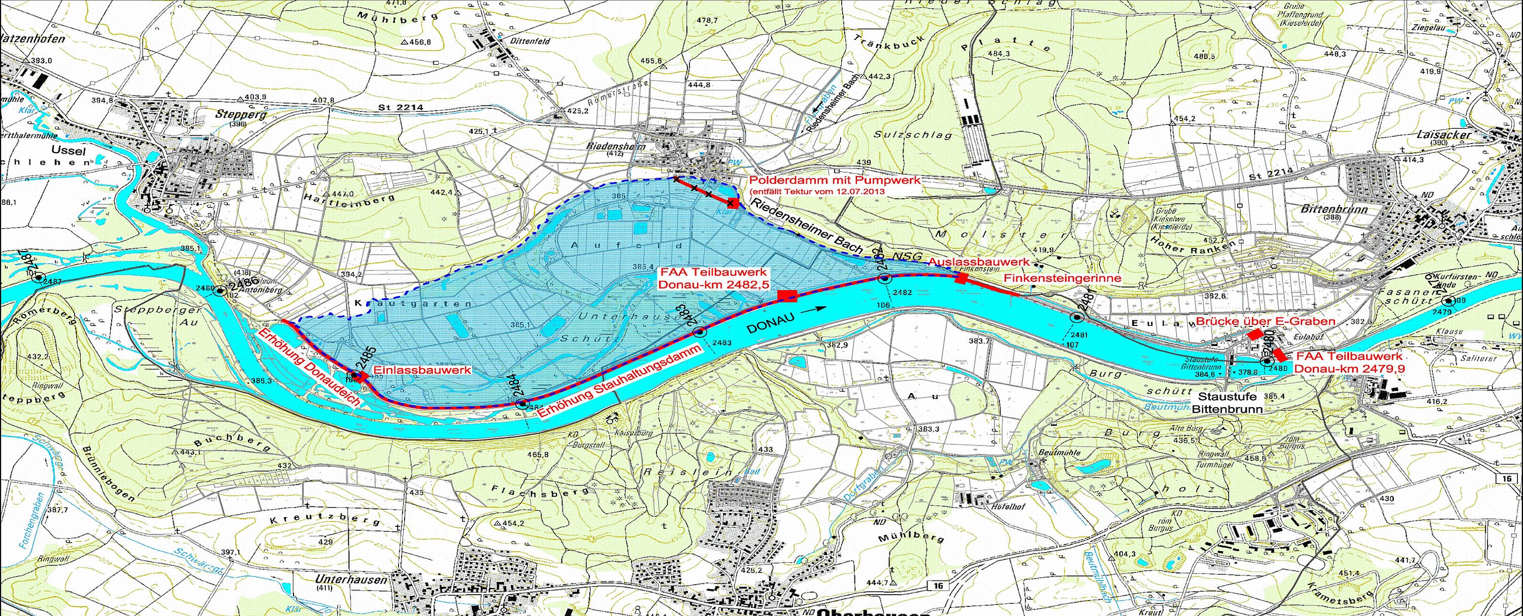 - Im Zuge des Flutpolderbaus wir für die Staustufe Bittenbrunn ein Umgehungsgerinne zum Fischaufstieg errichtet. Die bisher nicht gegebene Durchgängigkeit in der Donau wird wiederhergestellt. Zur Adaption des Auwaldes in der Unterhauser Schütt werden ökologische Flutungen geplant. Ab einem HQ1 erfolgt so wieder eine periodische Überflutung des seit dem Staustufenbau trockenen Auwaldes.