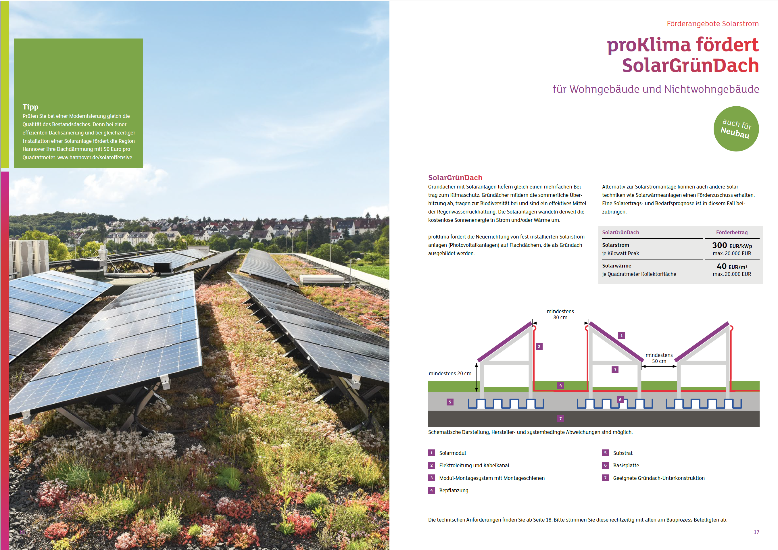 - SolarGrünDächer mit Solarstromanlagen wurden 2021 im proKlima-Fördergebiet mit 300 €/kWp und maximal 20.000 € pro Gebäude gefördert. Alternativ wurden Solarwärmeanlagen mit 40 €/kWp und maximal 20.000 € gefördert.