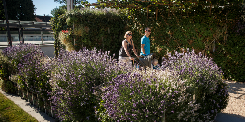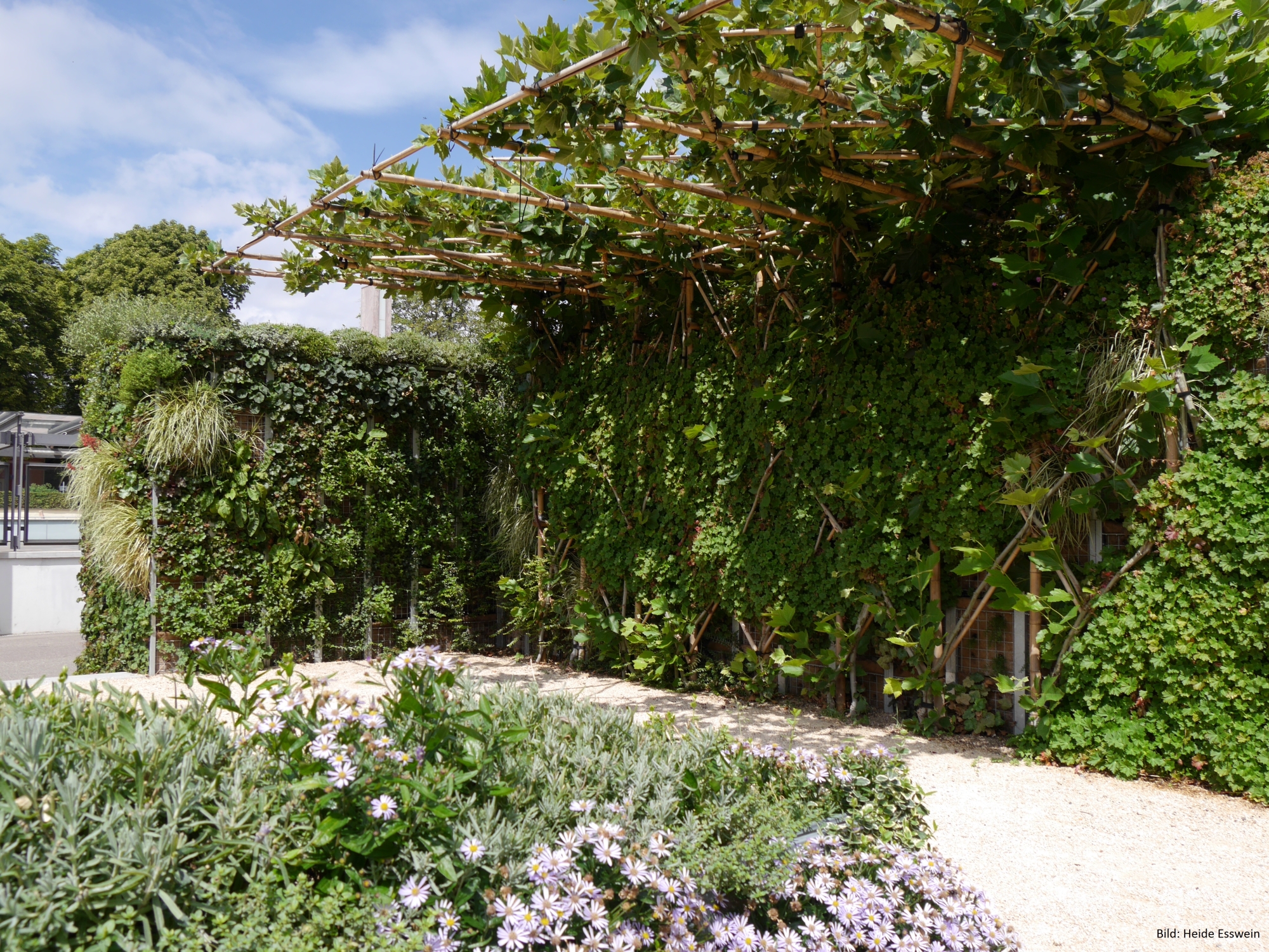 Mit 30 Pflanzenarten beziehungsweise -sorten und rund 6.900 Pflanzen auf cirka 140 Quadratmeter Vegetationsfläche entstand von Anfang an ein vielfältiges Muster aus blühenden und immergrünen Pflanzen. Das Dach aus 40 "baubotanisch" miteinander verbundenen jungen Platanen spendet Schatten. Die Bürgerinnen und Bürger haben bereits im ersten Sommer im Jahr 2014 vom „Grünen Zimmer“ profitiert.