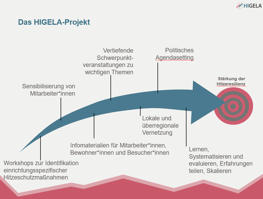 Auf Basis der Erfahrungen aus 2023 wurde für 2024 das HIGELA-Hitzeresilienzprogramm ins Leben gerufen, ein Online-Informationsangebot mit verschiedenen Veranstaltungen, welches sich insb. an stationäre Pflegeeinrichtungen aus der Freien Wohlfahrt richtet und somit weitere Einrichtungen zu dem Thema anspricht, informiert und diese vernetzt.