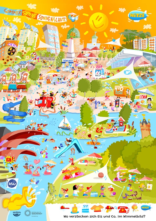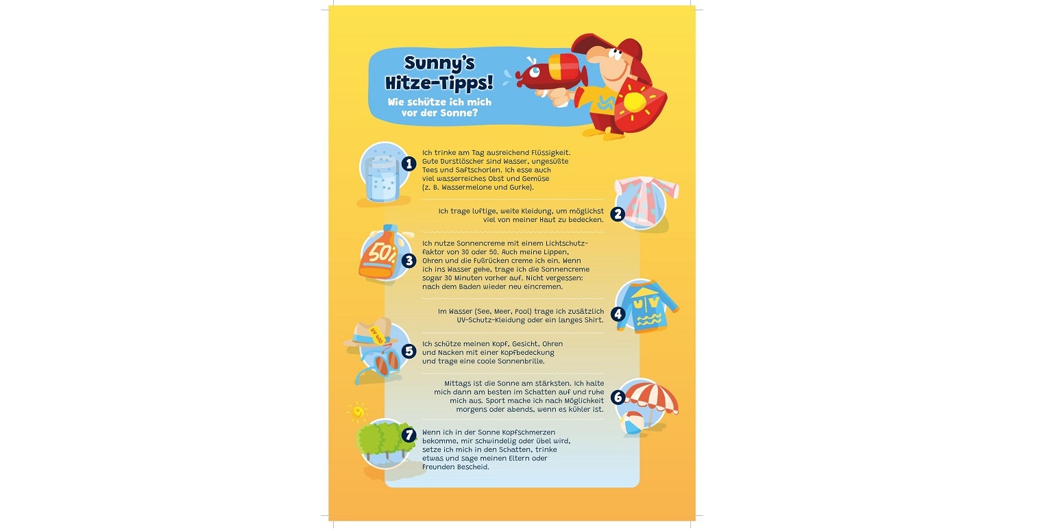 Für den Sommer 2024 liegt der Fokus auf Kindern und deren betreuenden Personen. Es wurden kindgerechte Materialien wie das „HITZI-Potsdams cooles Hitzeheft“, ein Wimmelbild, ein Comic mit den Figuren Sunny, Shine und Shadow und ein Hitzehelden-Song entwickelt. Dazu gibt es Flyer für Sorgeberechtigte und Fortbildungsangebote zum Hitzeschutz für pädagogisches Personal in Kindertagesstätten und Grundschulen. Auf Bestellung erhalten diese die Infomaterialien kostenfrei. Experimentierkurse und Mitmachexponate zum Thema Hitze-, UV-Schutz und Klimawandel wurden konzipiert und werden im NANO Science Center angeboten. Diese Maßnahmen werden öffentlichkeitswirksam auf Veranstaltungen wie den Schülergesundheitstagen präsentiert.