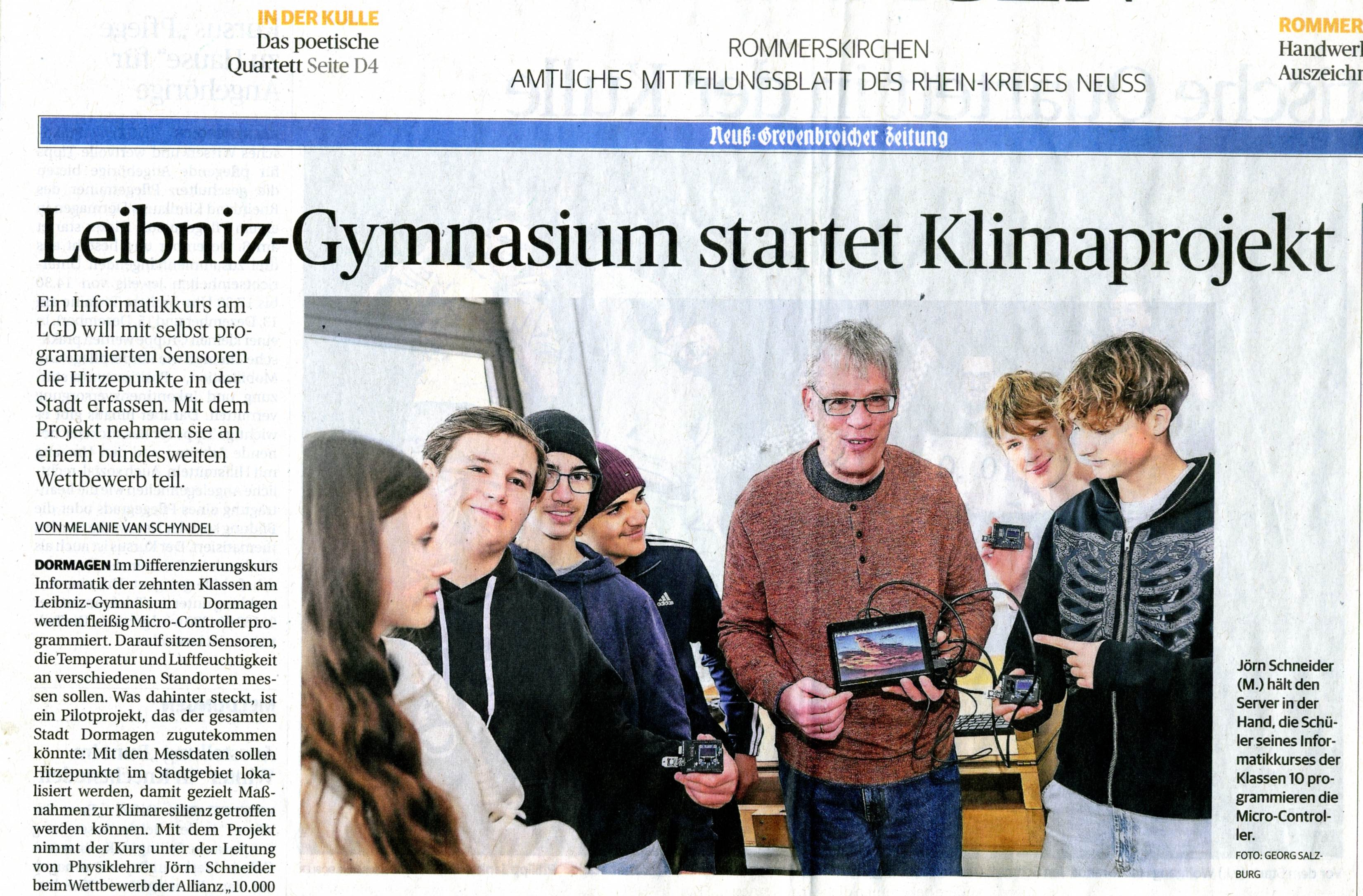 Der Projektschwerpunkt liegt auf der Wärmebelastung von städtischen Siedlungsflächen, Die letzten heißen Sommer haben drastisch vor Augen geführt, dass Hitzestreß für Menschen, Tiere und Pflanzen zu einem ernsthaften Problem in der Zukunft werden könnte. Als erstes Ziel sollen daher die städtischen Bereiche ermittelt werden, wo die Wärmebelastung am höchsten ist und wo zuerst Handlungsbedarf besteht. Dazu wurden in einem 10er Differenzierungskurs Informatik am Leibniz-Gymnasium Dormagen einfache TCP/IP basierte Temperatur/Feuchtesensoren entwickelt, gebaut und programmiert. Insgesamt sollen über das Dormagener Stadtgebiet 50 solcher Sensoren in Privathaushalten zum Einsatz kommen. Benötigt wird dafür nur eine Steckdose und ein WLAN-Zugang. Die Sensoren erfassen automatisch jede 30 Minuten die Temperatur und den Feuchtegrad und übermitteln diese Werte an einen von den Schüleri*nnen selbst programmierten Server. Diese Rohdaten sollen später in Echtzeit grafisch ausgewertet werden und den Bürger*innen von Dormagen kostenlos zur Verfügung gestellt werden. Ebenfalls bekommt die Stadt Dormagen Zugriff auf alle Daten, die die städtischen Messungen auf öffentlichen Flächen und Gebäuden ergänzen wird. Als zweite Datenquelle werden weitere 50 LORAWAN-Sensoren über das Stadtgebiet verteilt installiert. Diese sind so ausgelegt, dass sie rund 10 Monate völlig autark Temperatur und Feuchte messen und über das LORAWAN-Netzwerk zur Verfügung stellen. Erst danach ist ein Batteriewechsel erforderlich. Diese Sensoren arbeiten also unabhängig vom WLAN und sollen auch für Referenzwerte außerhalb des Siedlungsgebietes zum Einsatz kommen. Nach einer erfolgreichen Testphase soll das Projekt im Rahmen von geplantebn Fortbildungen (in Kooperation mit der IHK Düsseldorf und dem ZDI Neuss) auch anderen Schulen zur Verfügung gestellt werden.