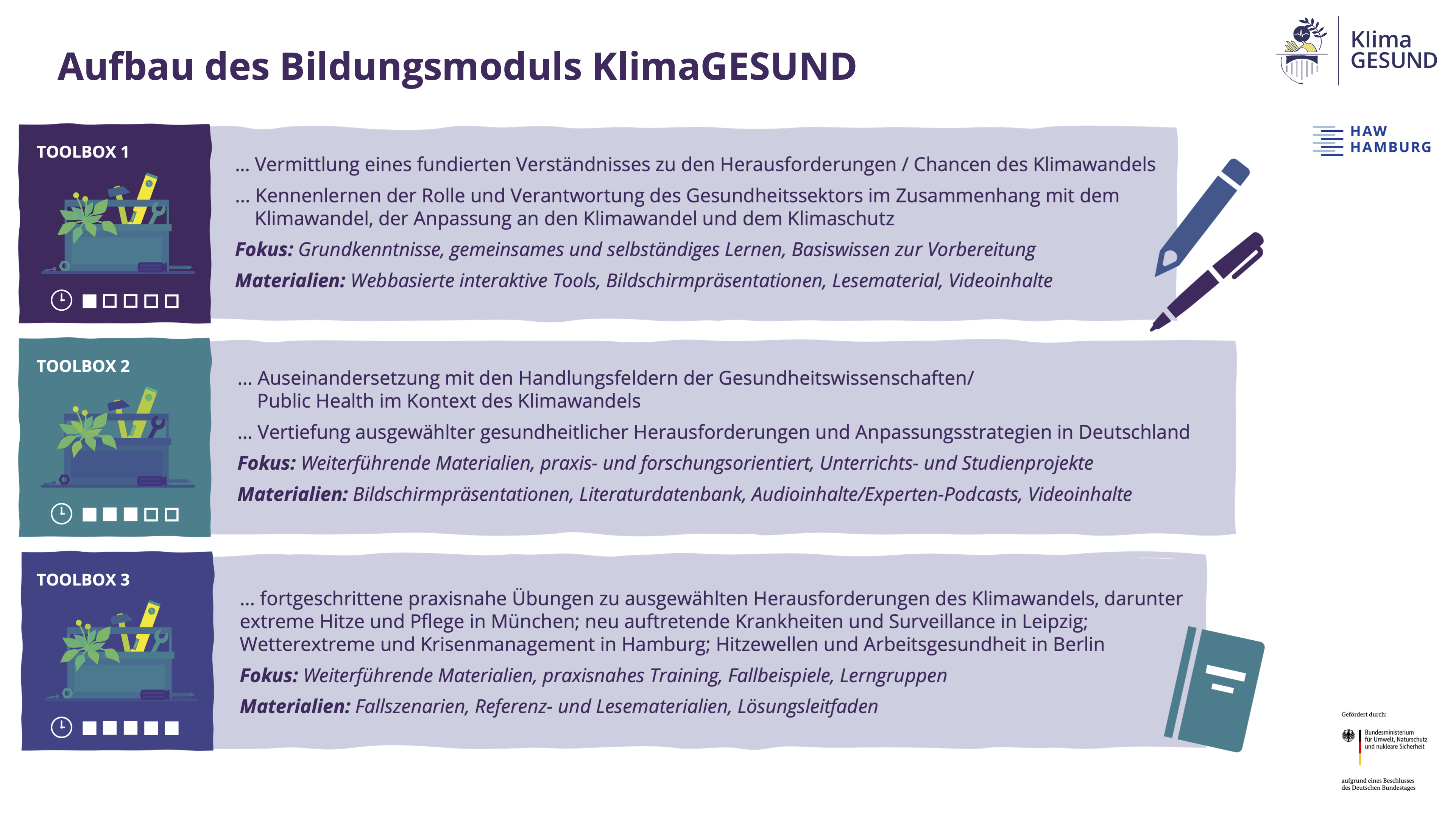 [Schritt 2] Entwicklung eines modular gestalteten Bildungsmoduls nach dem Konzept des Blended Learning zur Einführung des Themas: Klimawandel und Klimaanpassung aus der Sicht der Bevölkerungsgesundheit in der hochschulischen Ausbildung der Gesundheitswissenschaften/Public Health, mit den Foki: