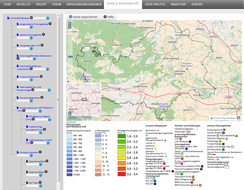 Projektziel war es, ausgewählte Maßnahmen des 2010 erarbeiteten Klimaanpassungskonzeptes für den Landkreis Mansfeld Südharz (LK MSH) und die Stadt Sangerhausen (SGH) als Leuchtturmprojekte im Zusammenwirken unterschiedlicher Akteure modellhaft umzusetzen. Die erforderlichen Maßnahmen umfassten eine zielgruppenspezifische Informationsbereitstellung, um die Erfordernisse der Klimaanpassung kontinuierlich als Teil der nachhaltigen kommunalen Entwicklung etablieren zu können. Schwerpunkte waren die Aufbereitung und Kommunikation von komplexen Sachverhalten und Lösungsvorschlägen für Lokalpolitiker*innen sowie Verwaltungsmitarbeitende mittels Vulnerabilitätskarten, eine interaktive Klimpass-Webseite und begleitende regionale sowie zielgruppenspezifische Informationsveranstaltungen und -materialien. Die Zielgruppe soll befähigt werden, das Thema "Anpassung an den Klimawandel im Verwaltungshandeln" zu berücksichtigen sowie als Multiplikator*innen in der Region zu wirken. Die Eigenvorsorge in Unternehmen und Institutionen soll gestärkt werden. Eine Vernetzung der Akteur*innen im Rahmen des bestehenden Akteursnetzwerkes soll als Element des Projektes weiter entwickelt werden.